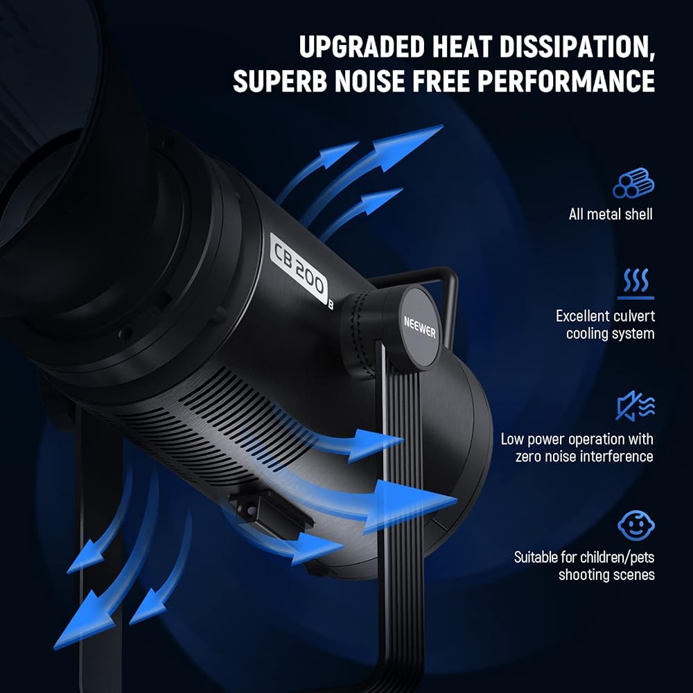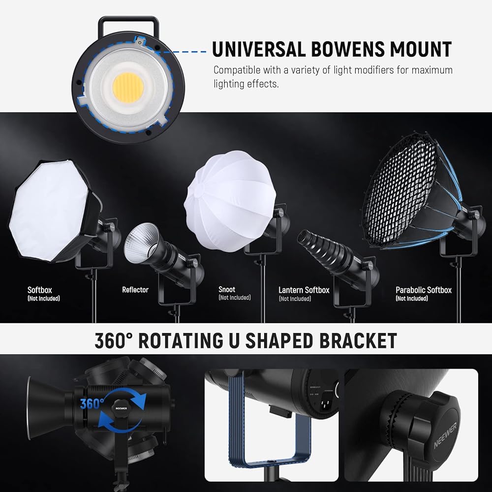 نيوير مصباح فيديو LED CB200B 210 واط مع جهاز تحكم عن بعد 2.4 جيجا/تطبيق، مصباح معدني بالكامل ثنائي اللون سي او بي مستمر مع حامل بوينز 90000 لوكس/1 متر 2700-6500 كلفن CRI/TLCI97+ 12 تاثير لتسجيل