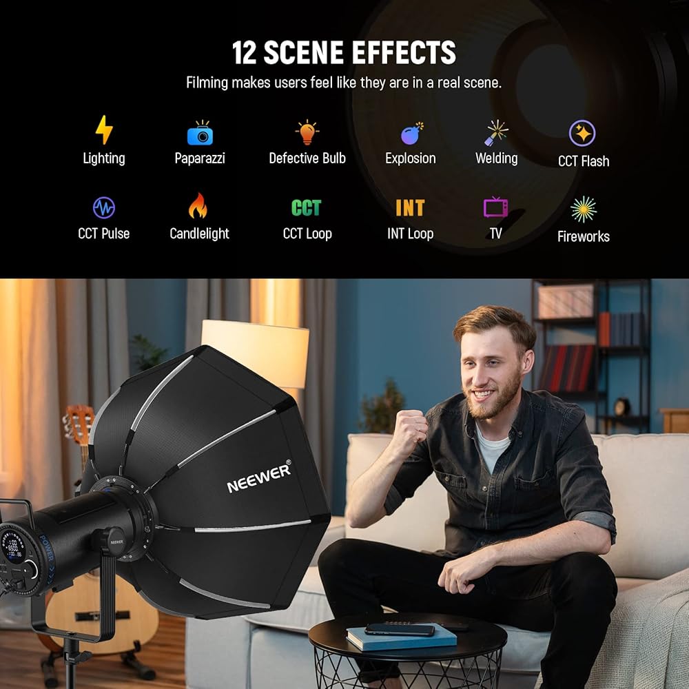 【تحكم في تطبيق انفينيتي مدمج 2.4 جيجا】 يتيح تطبيق نيوير المزود بتقنية اتصال نيوير Infinity إمكانية التعديل الديناميكي لإعدادات الإضاءة المتعددة في وقت واحد ضمن 66 قدم/ 20 متر. متوافقة مع نيوير SL90، RGB1، RGB C80، RGB 1200، MS60C، MC60B، BH30S، CB60B، تحتوي هذه المصابيح أيضًا على نظام مدمج 2.4 جيجا و99 قناة، مما يجعلها على نفس القناة للتحكم عن بعد في حدود 328 انش/100 في نفس الوقت.