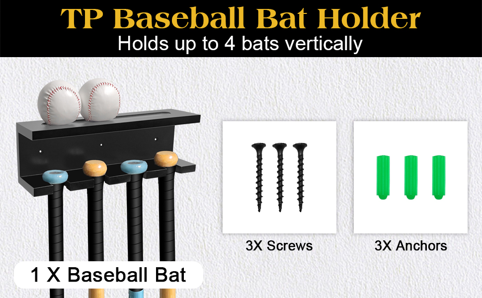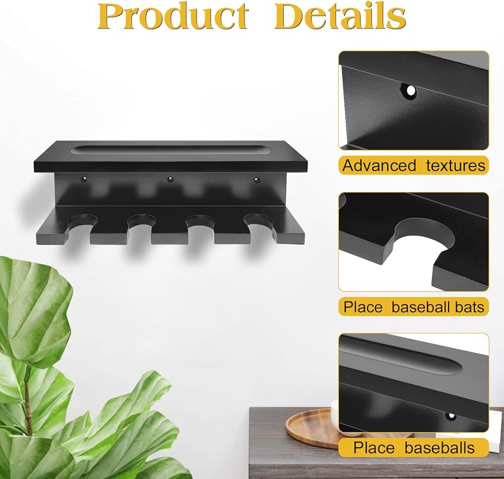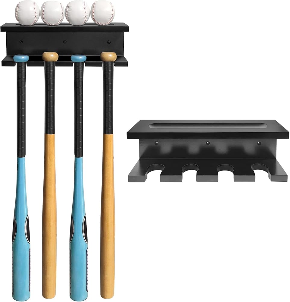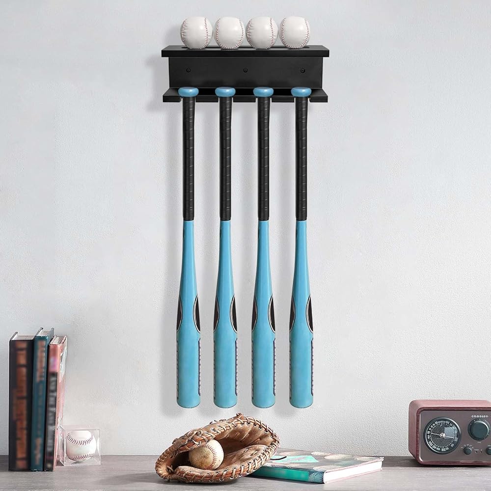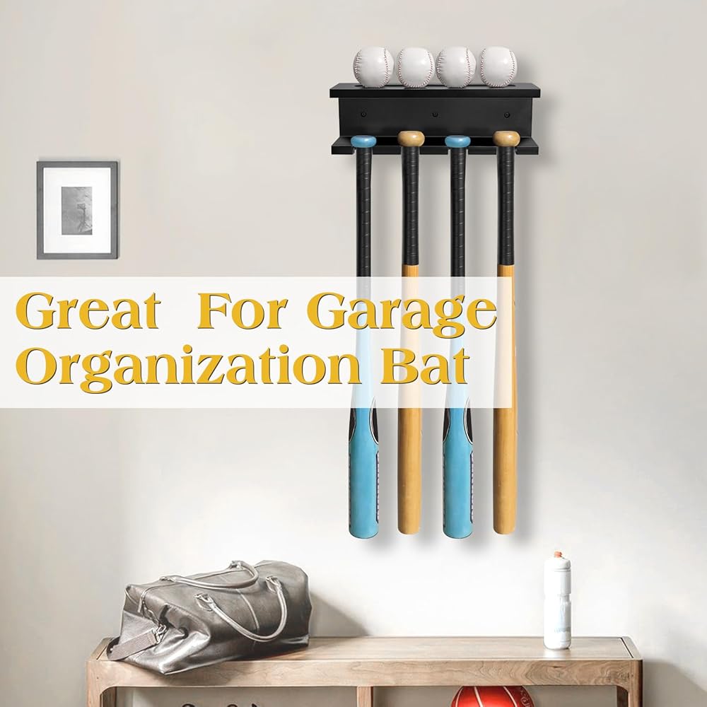 【حامل عرض مضرب البيسبول】يمكن لرف تخزين مضرب البيسبول أن يحمل 4 مضارب عموديًا في نفس الوقت. إنها مناسبة لمعظم أحجام الخفافيش.
