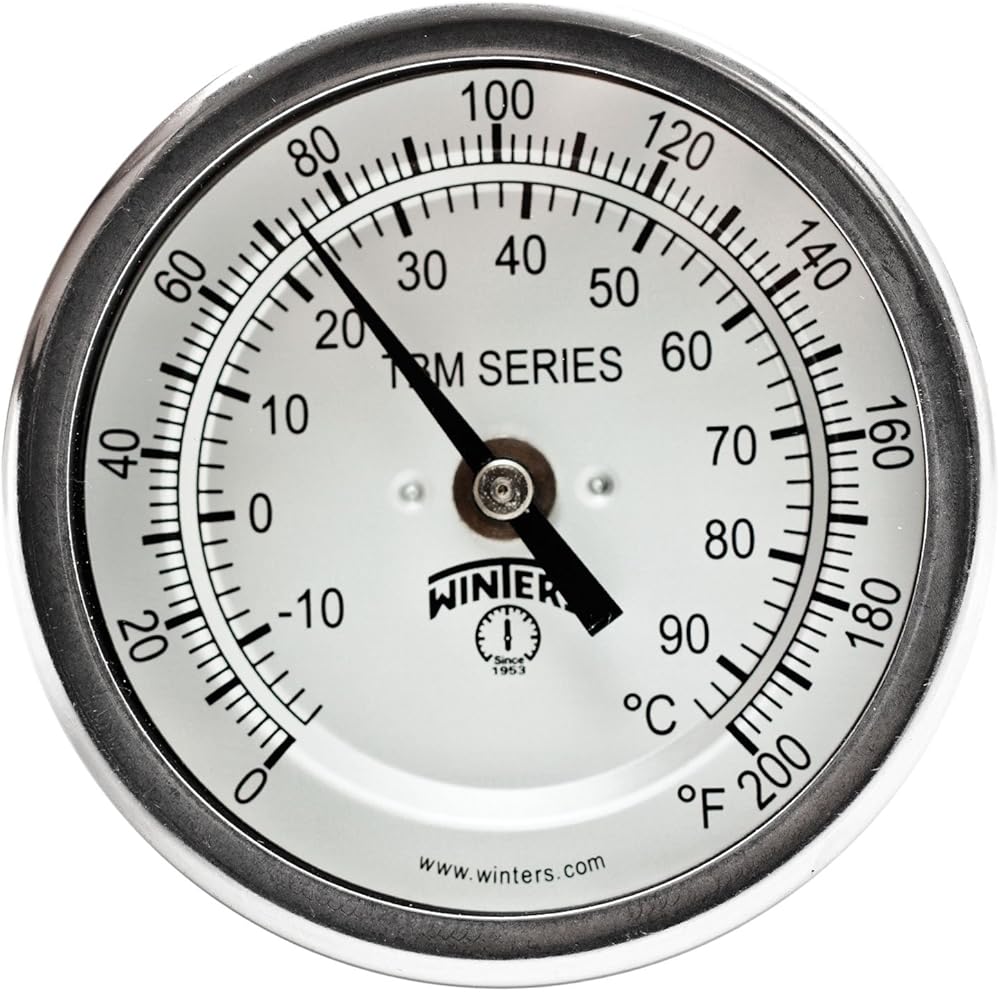 A general purpose, versatile stainless steel 304 thermometer. Bi-metallic sensing element for reliable readings. Fixed centre back connection. Anti-parallax dial that reduces operator reading errors. Welded stem. Application: industrial process, heating and air conditioning, ventilation and wastewater. Dial 3" aluminum with black markings, dish-shaped. Case: stainless steel 304 AISI. Recalibrator: standard. Ring: stainless steel 304 AISI. Sensing element: bi-metallic coil. Pointer: aluminum, painted black. Maximum operating pressure: 125 psi (861 kPa). Operating temperature: 75 percent of full scale value (recommended maximum). Ambient temperature: -58/248 degree fahrenheit. +/- 1 Percent accuracy. Enclosure rating IP68. Lens: Glass standard, hermetically sealed. Re-zero adjustment screws are standard on the 3" dial. Connection: 1/2" NPT standard. Temperature ranges: 0 degree F to 200 degree F and -20 degree C to 90 degree C. RoHS Compliant.