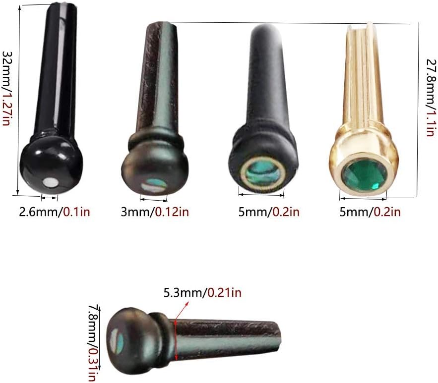 ﹣Guitar bridge pins: 27.8 mm in length and 7.8 mm in diameter of its' head,diameter 4.9mm Size: Approx.27.8X7.8X4.9mm.