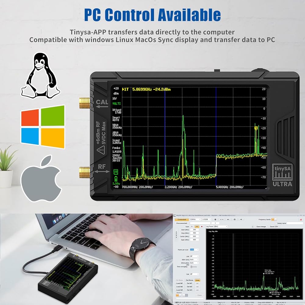 [التحكم في الكمبيوتر] يتم توصيله بجهاز الكمبيوتر عبر USB، ويصبح محلل طيف يتم التحكم فيه بواسطة الكمبيوتر أو مولد إشارة. يقوم Tinysa-APP بنقل البيانات مباشرة إلى الكمبيوتر. تطبق واجهة USB بروتوكول CDC وهناك مجموعة كبيرة من الأوامر التي يمكن استدعاؤها عبر الواجهة التسلسلية. يمكن استخدام هذا الأمر لإجراء قياسات أو تحديث الإعدادات الداخلية. سيتم تثبيت برنامج التشغيل لنظام Windows تلقائيًا بعد الاتصال بجهاز كمبيوتر يعمل بنظام Windows. برنامج التشغيل لنظام التشغيل Linux مدمج في النواة.