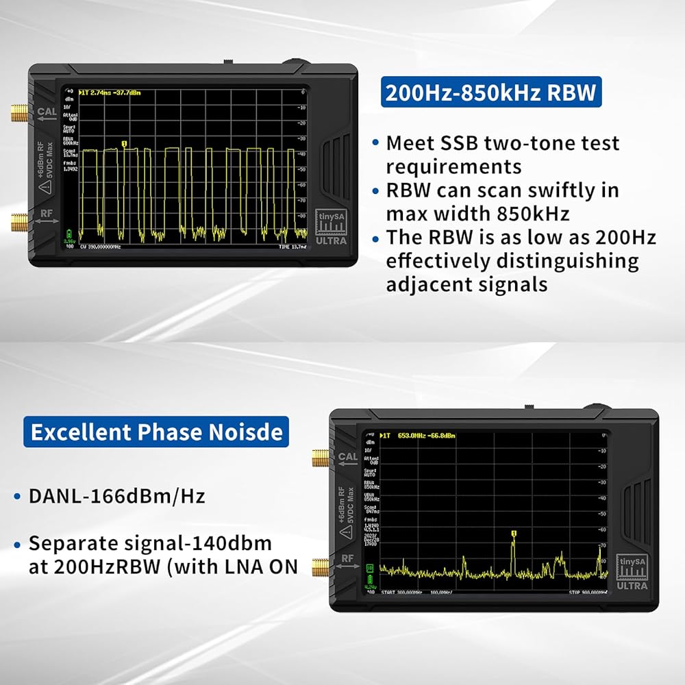 【200 هرتز-850 كيلو هرتز RBW】يصل RBW إلى 200 هرتز، مما يمكنه التمييز بشكل فعال بين الإشارات المجاورة وتلبية متطلبات اختبار التشكيل بين الأقمار الصناعية المزدوج SSB. مخفف خطوة الإدخال من 0 ديسيبل إلى 31 ديسيبل (لا يمكن استخدامه مع LNA). محلل tinysa المطور المدمج في بطارية قابلة للشحن بقدرة 3000 مللي أمبير في الساعة، مع كابل شحن من النوع C ومؤشر شحن LED، يمكن شحنه بالكامل في غضون 3 ساعات.