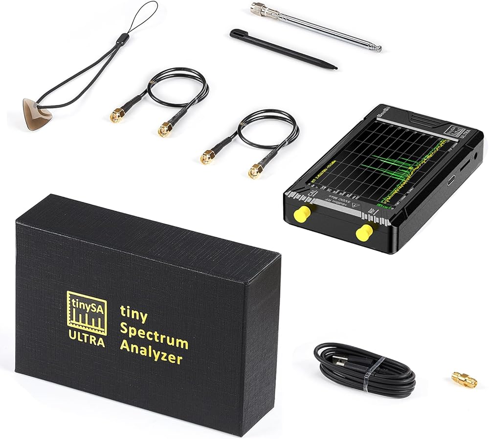 【قائمة الحزمة 】 1x محلل الطيف الفائق Tinysa ؛ 2 × 30 سم كابل ALSR100 SMA؛ 1 × كابل بيانات USB من النوع C؛ 1 × موصل أسطواني SMA-SMA؛ 1 × TLonyard وريشة تعمل باللمس؛ 1 × هوائي مع موصل SMA. 1 × بطاقة MicroSD بسعة 32 جيجابايت (موصولة بالمضيف)، 1 × قلم شاشة تعمل باللمس.