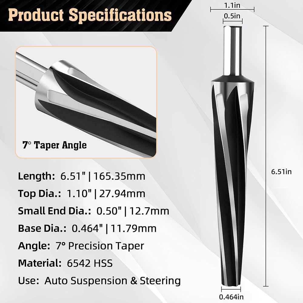 🔧 Professional Precision for Automotive ExcellenceIntroducing our premium 7 Degree Ball Joint Tapered Reamer, the essential reamer tool for every automotive professional. With a design focusing on precision, this tool ensures accurate fittings for ball joints and tie rods, making it indispensable for various automotive applications. ⚙ Versatile and DurableExperience unmatched versatility with our reamer drill bit. Whether it's automotive repair, bridge construction, or metal fabrication, this tool is engineered to drill perfect tapered holes with ease. Made from robust 6542 High-Speed Tool Steel, it guarantees long-lasting performance in even the most demanding environments. User-Centric DesignOur reamer bit features an optimized design for maximum efficiency and comfort. The unique shank design provides a stable grip, enhancing control and reducing fatigue during prolonged use. It's a blend of technology and ergonomics designed for professionals who demand the best. 🌐 Universal CompatibilityThis reamer tool is not just about precision; it's about universal application. Its high-quality blade is compatible with a range of materials, from aluminum to steel, ensuring smooth operation and versatility across multiple projects. Commitment to QualityAt the core of our product is a commitment to quality. Each reamer drill bit is precision-ground for optimal angle and roundness tolerances, offering the reliability and performance that professionals need. Embrace the power of precision with our 7 Degree Ball Joint Tapered Reamer.