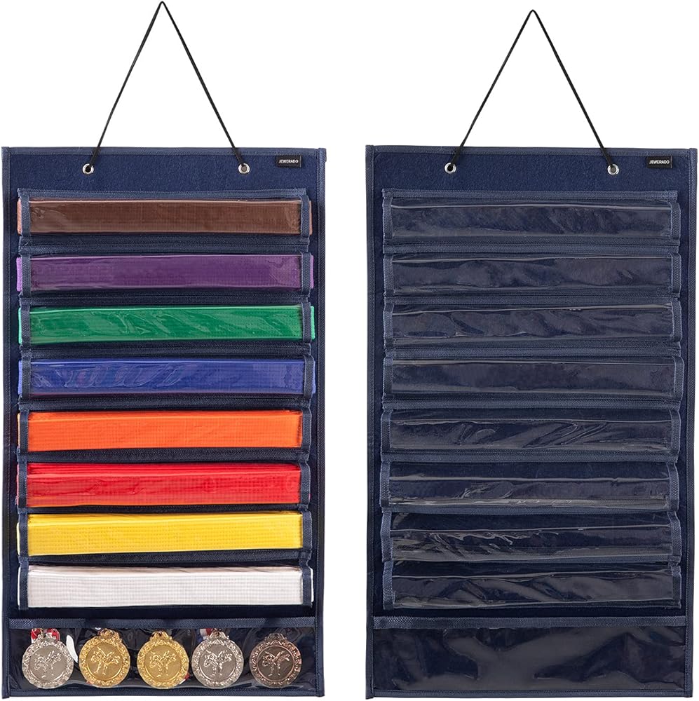 الأحزمة والجوائز -- 8 جيوب شفافة للأحزمة، وجيبان للتايكوندو، والكاراتيه، والكينبو، والفنون القتالية المختلطة، وميداليات جيو جيتسو وغيرها من المكافآت. (الأحزمة غير متضمنة)، ويستخدم الجيب السفلي لحمل الميدالية وهو مثالي لحملها ميداليات أو شرائط أو حبال أو غيرها من العناصر الجديرة بالإنجاز.