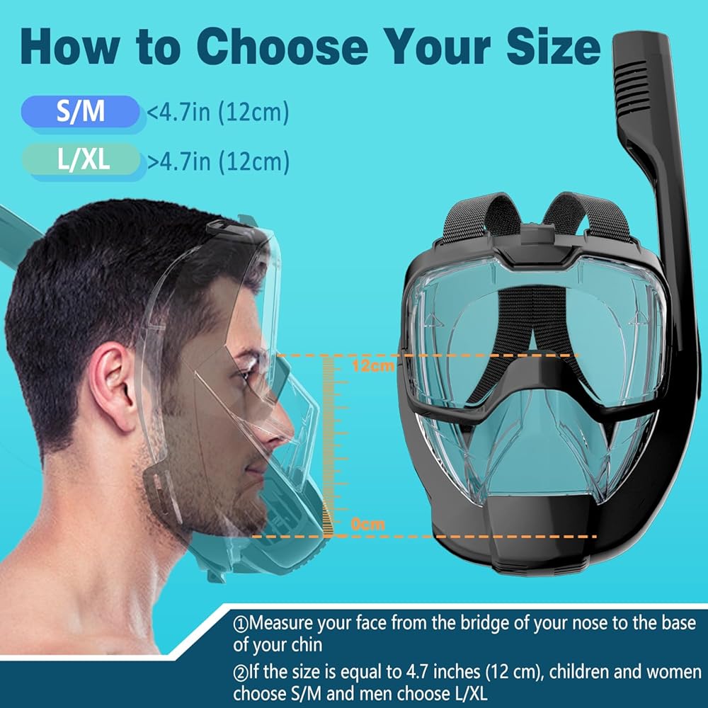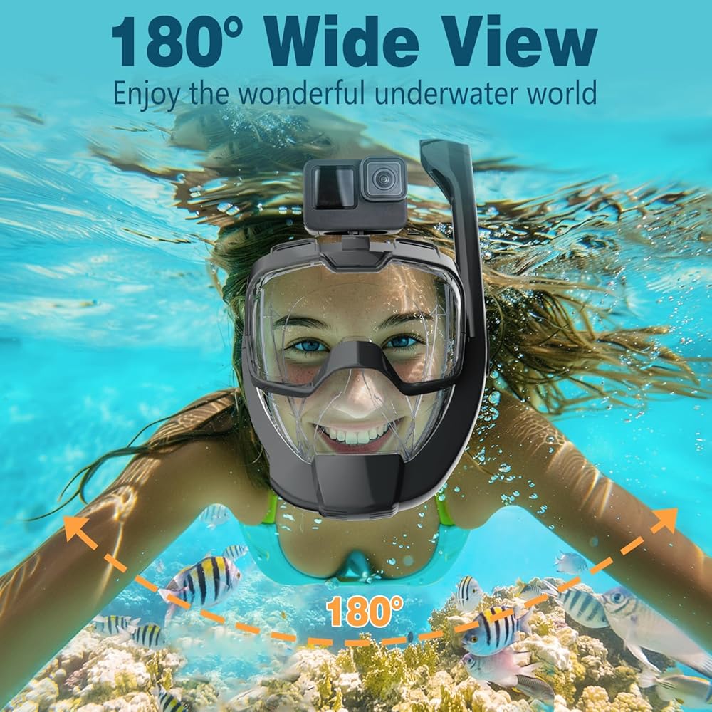 【رؤية بانورامية 180 درجة】 تصميم النافذة المسطحة لمعدات الغطس يمنع تشويه الرؤية تحت الماء، ويمنع الغثيان والقلق. يوفر تصميم الوجه الكامل مجال رؤية أوسع، مما يمنحك تجربة غامرة أكثر تحت الماء. مع حامل الكاميرا القابل للفصل، يمكنك بسهولة توصيل الكاميرا الخاصة بك لالتقاط ومشاركة مغامرتك مع الأصدقاء والعائلة.