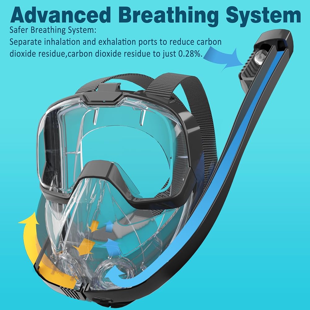 【سهل التنفس مع نظام أكثر أمانًا】يتميز قناع الغطس لكامل الوجه للبالغين بنظام غطس جانبي متطور مع حجرة أكبر وأنابيب استنشاق وزفير منفصلة. يمنع هذا التصميم الاختناق أو صعوبة التنفس الناتج عن اختلاط ثاني أكسيد الكربون والهواء. تعمل الحجرة الأكبر والمنافذ المزدوجة على تقليل مستويات ثاني أكسيد الكربون إلى 0.28% فقط!
