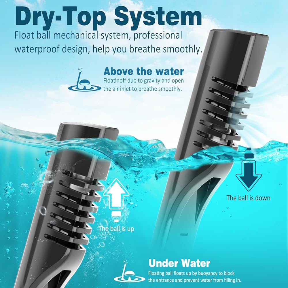 【تصميم متطور مضاد للضباب ومضاد للتسرب】تمنع أنابيب الاستنشاق والزفير المنفصلة الضباب، بينما يضمن الطلاء المضاد للضباب على العدسات والحشوات رؤية واضحة. سدادة السيليكون المتقدمة المقاومة للتسرب وتصميم الكرة العائمة تحافظ على الماء خارج القناع.