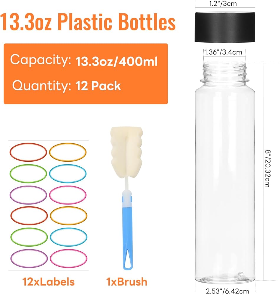 تتضمن العبوة: 12 عبوة من الزجاجات البلاستيكية سعة 400 مل مع أغطية بلاستيكية، و12 ملصقًا وفرشاة واحدة. أبعاد الزجاجات: قطر 6.35 سم × ارتفاع 20.32 سم، قطر الفم 1.36 سم.