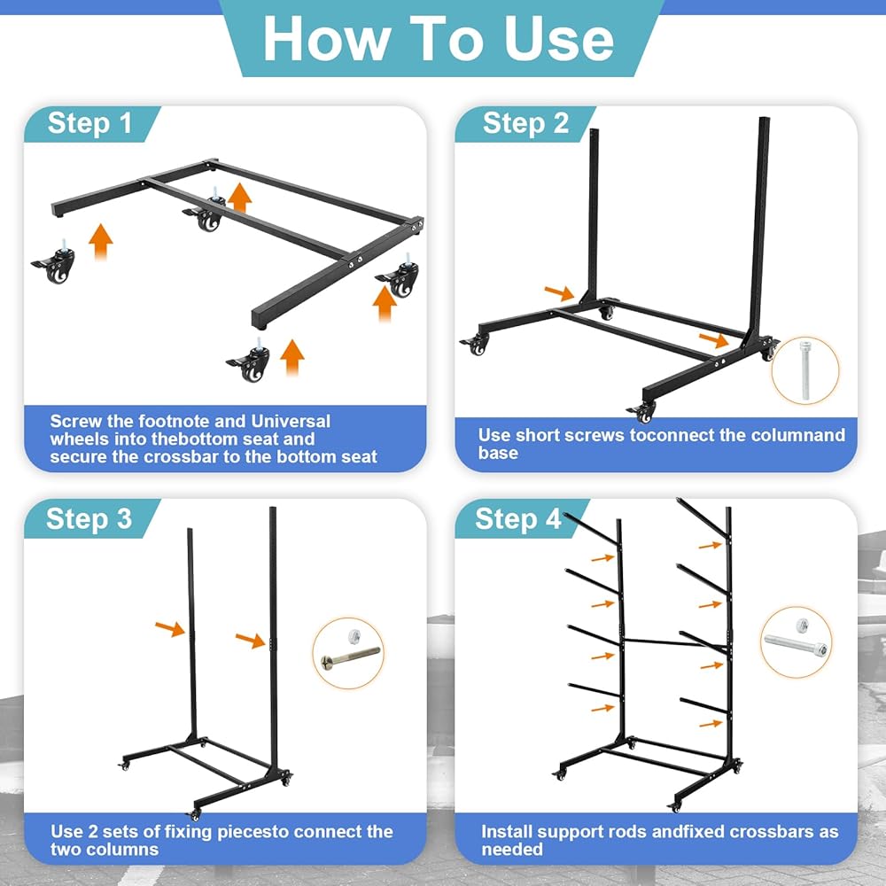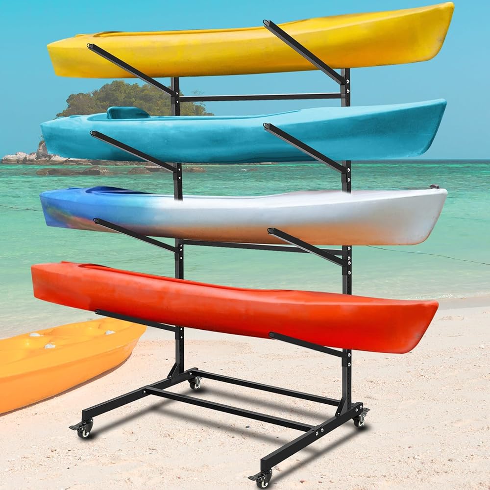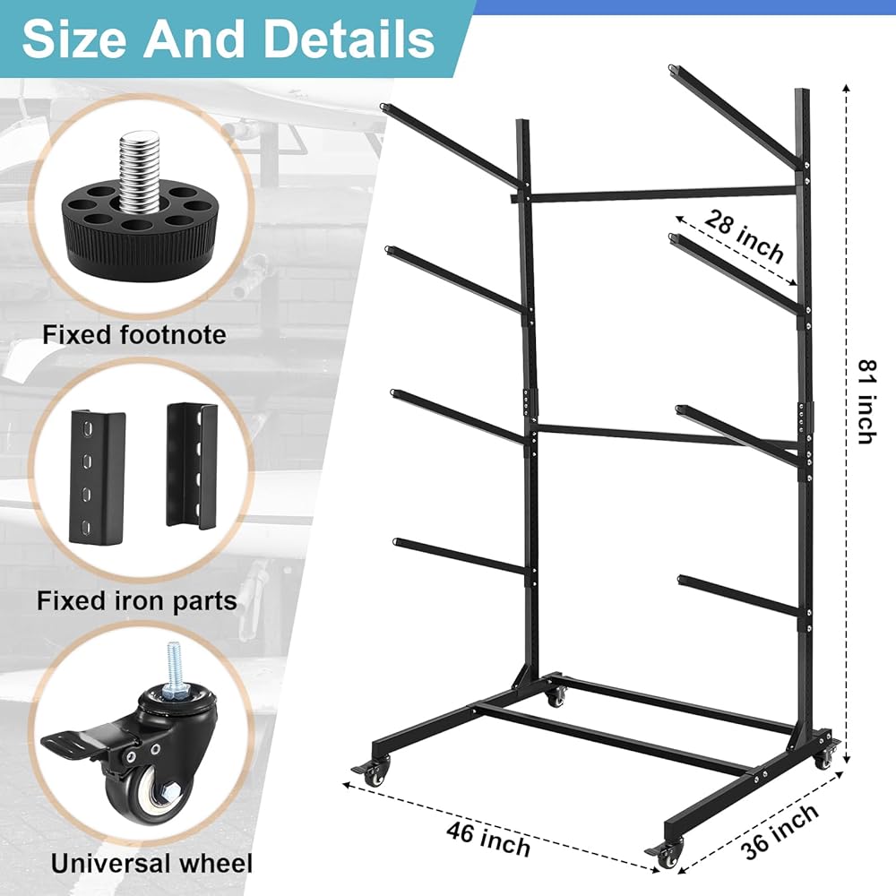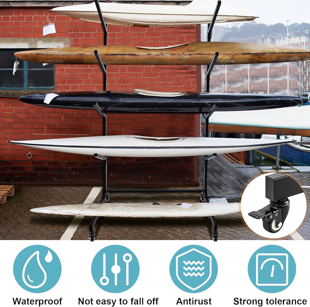 Optimize Your Storage: the assembled rack for outdoor storage measures 81" x 46" x 36", with 4 wheels for easy moving and can accommodate up to 4 kayaks or surfboards, stacked to save floor space