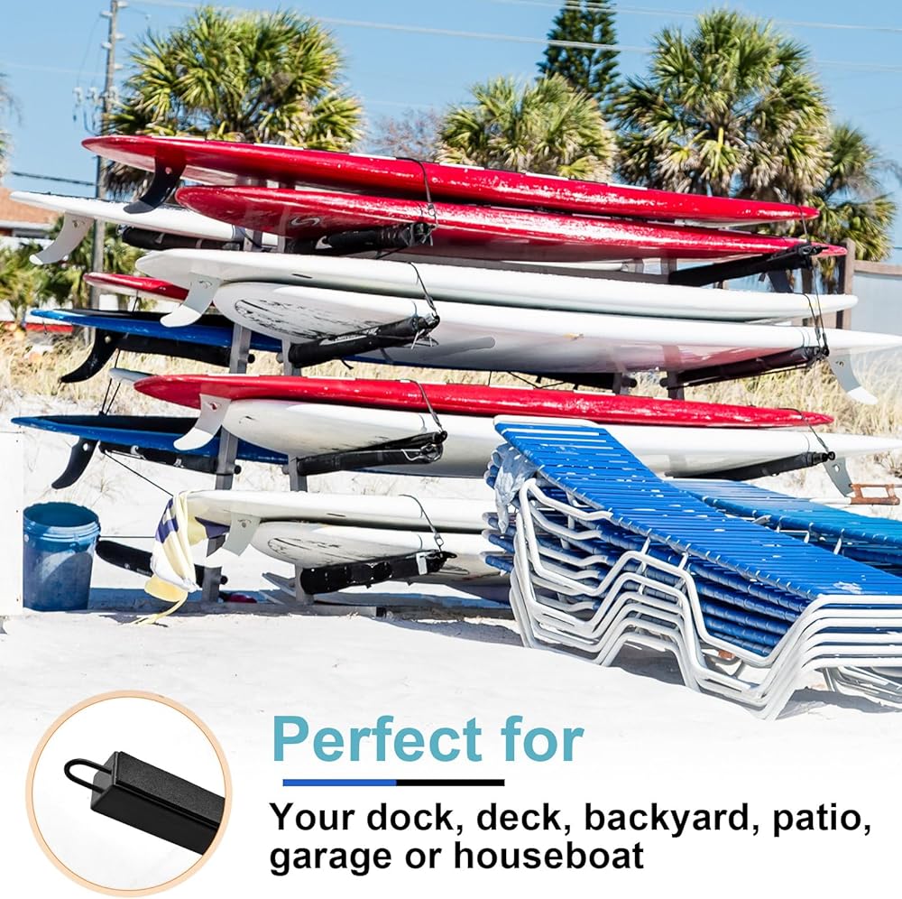 Freestanding Design: this movable free standing surfboard rack fits into any outdoor space, ideal for your dock, deck, backyard, patio, garage or boat house; The spacing between each side is adjustable