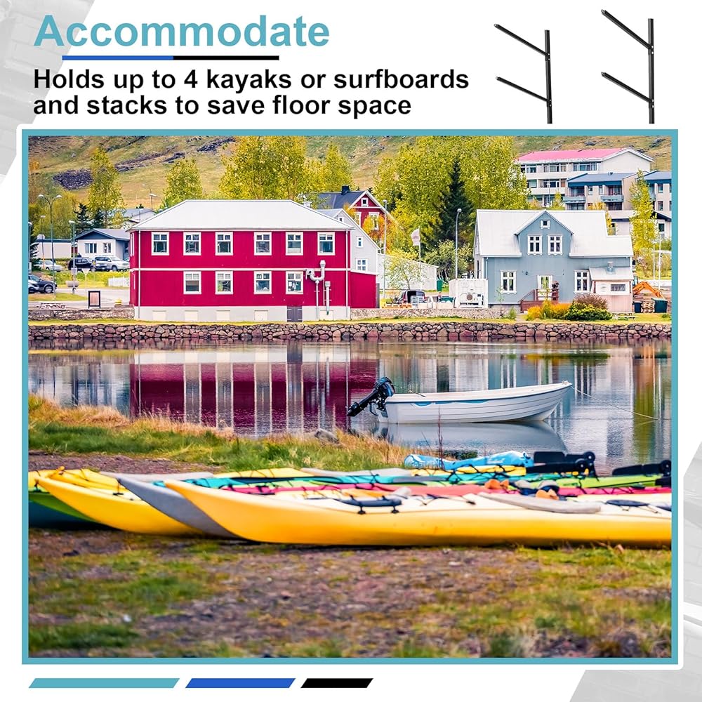 Our kayak holder holds up to 4 vertical paddleboards or surfboards, Single-sided display rack with padded base accommodates additional boards or kayaks, Thick padding and adjustable/removable arms prevent scratches and damage.
