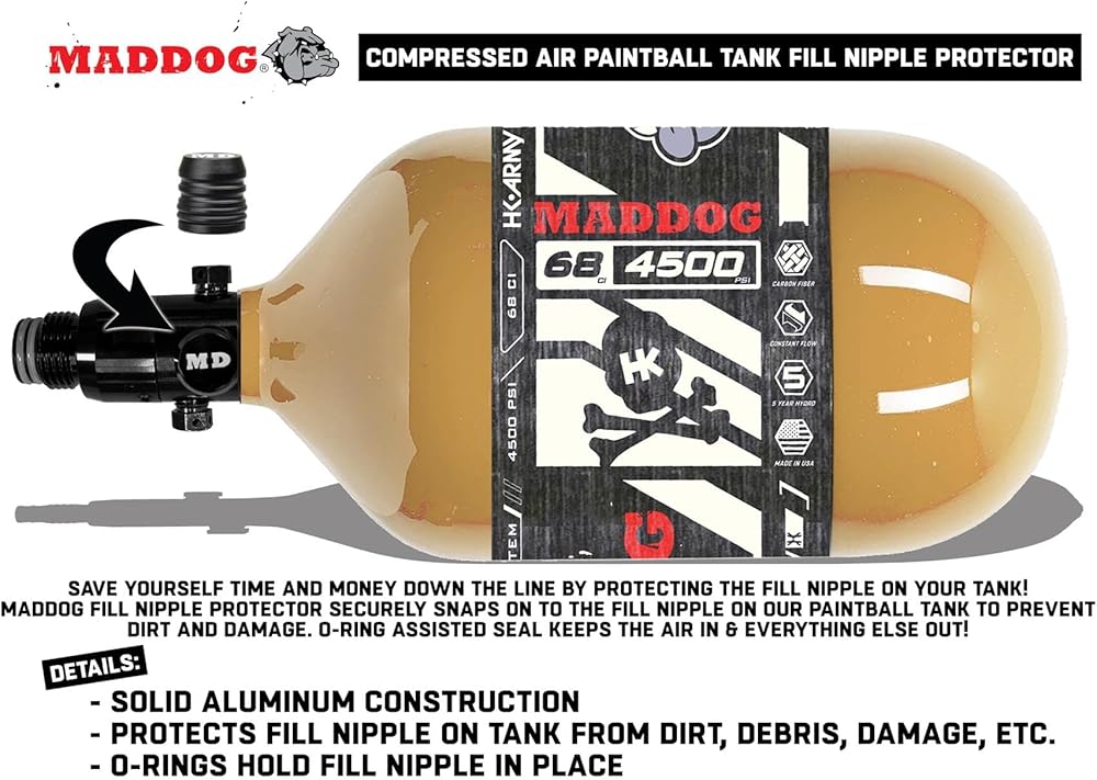 YOU'LL TANK US LATER! Combo comes with the Maddog HPA Tank Fill Nipple Protector - Save yourself time and money down the line by protecting the fill nipple on your tank. This fill nipple protector securely snaps on to the fill nipple on your tank to prevent dirt and damage, a must-have for any paintball player. O-ring assisted seal keeps the air in and everything else out.