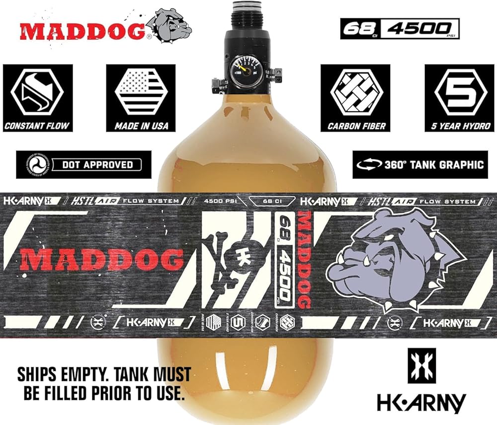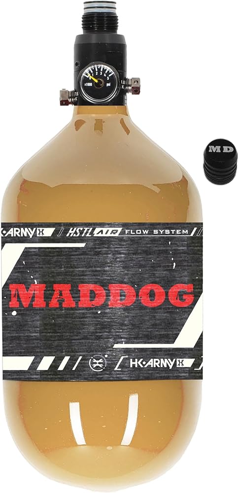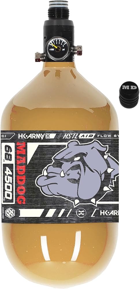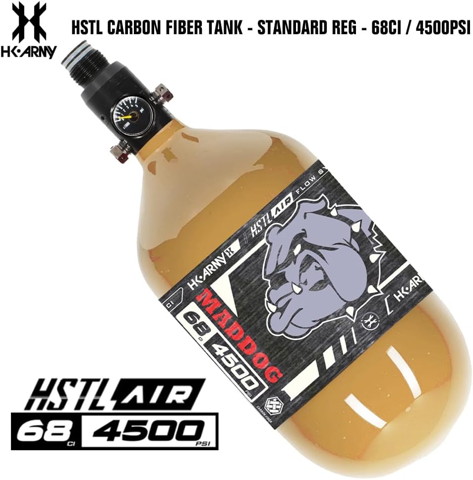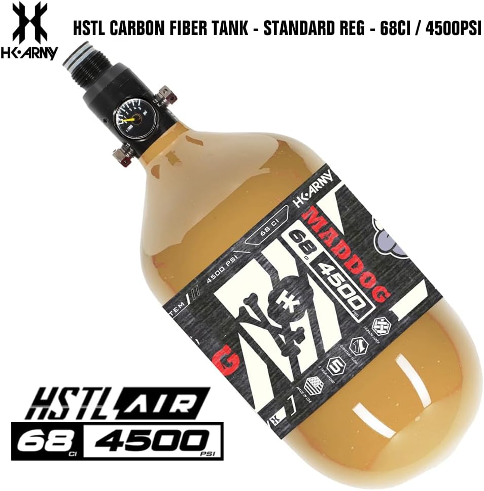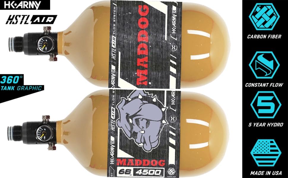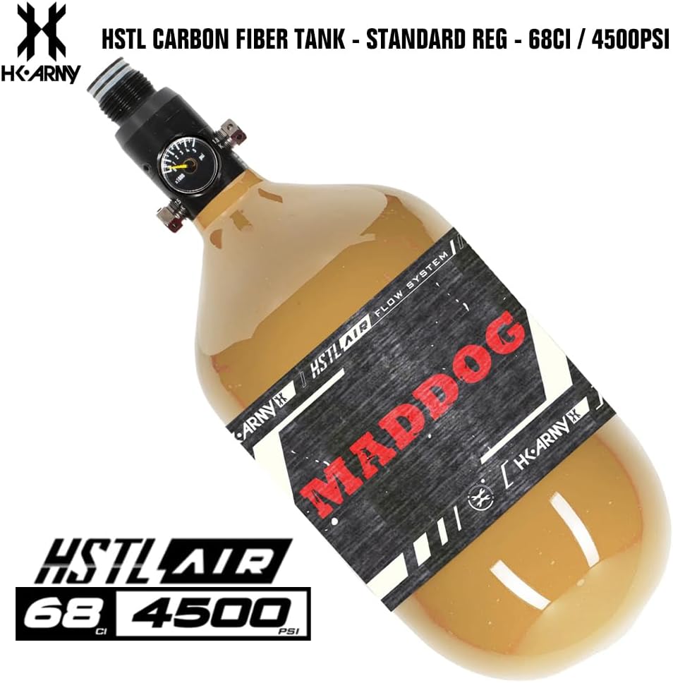 UPGRADE NOW! Maddog HK Army HSTL Air Performance Carbon Fiber Paintball Tank is the Perfect Compressed Air HPA Tank For Your Paintball Gun Marker! HK Army 68/4500 tank bottle with an Adjustable Regulator, 5 Year Hydro Cycle, Constant Flow, and a Carbon Fiber Bottle MADE IN THE USA! Includes Rubber thread cover and Maddog Fill Nipple Protector - You'll Tank Us Later!