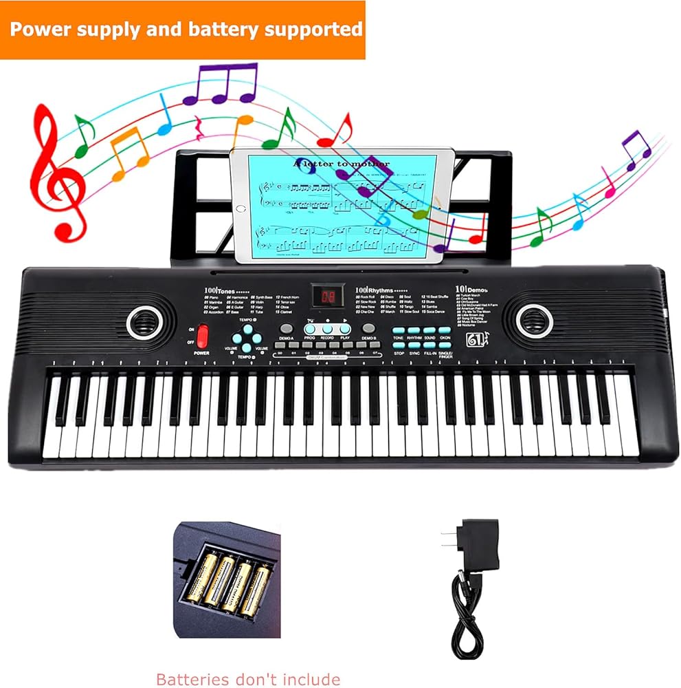 ♫ 【لوحة مفاتيح موسيقية مع طريقتين للطاقة 】: يمكن تشغيل بيانو لوحة المفاتيح المحمول المكون من 61 مفتاحًا بواسطة محول طاقة قياسي أو بطاريات AA 1.5 فولت (غير متضمنة)، بالإضافة إلى استخدام أدوات الموسيقى هذه في المنزل. يمكن أيضًا اصطحاب البيانو الرقمي أثناء التنقل وتشغيله في الهواء الطلق أو في الحفلات