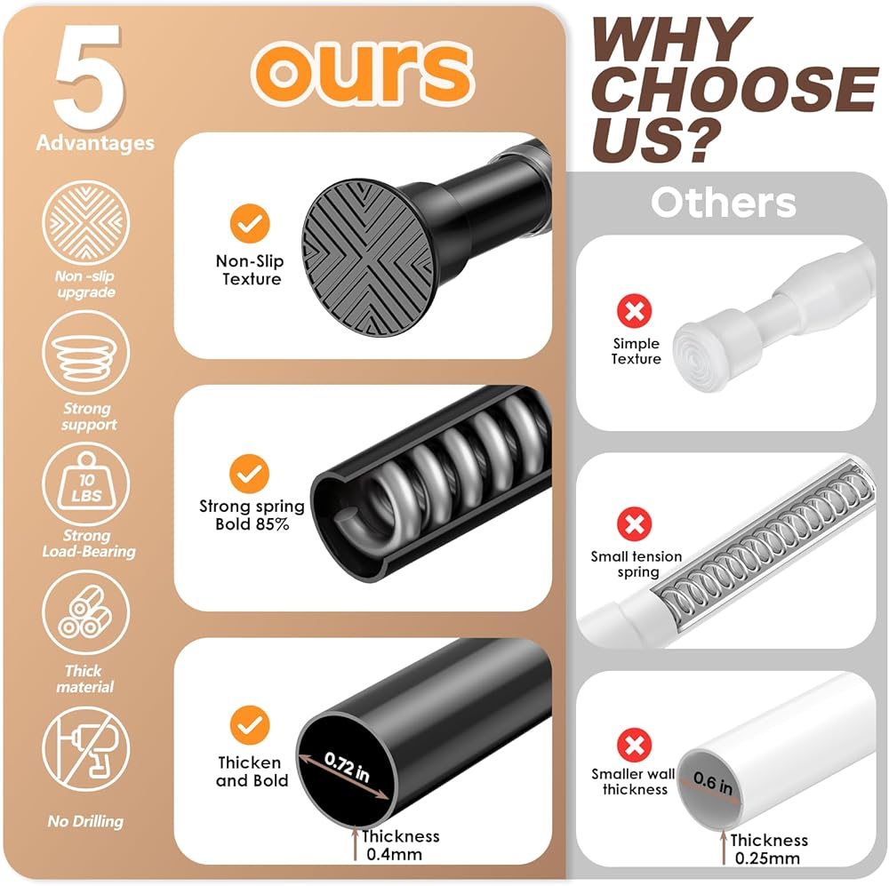 【دعم معزز】 - يتميز قضيب ستارة الشد الخاص بنا بتصميم معزز مع زيادة بنسبة 50% في سمك الجدار، مما يوفر دعمًا لا مثيل له. فهو يتحمل بسهولة 10 رطل من الضغط دون الانحناء، مما يضمن تجربة مستخدم خالية من الهموم.