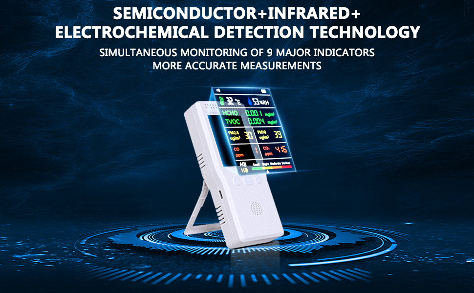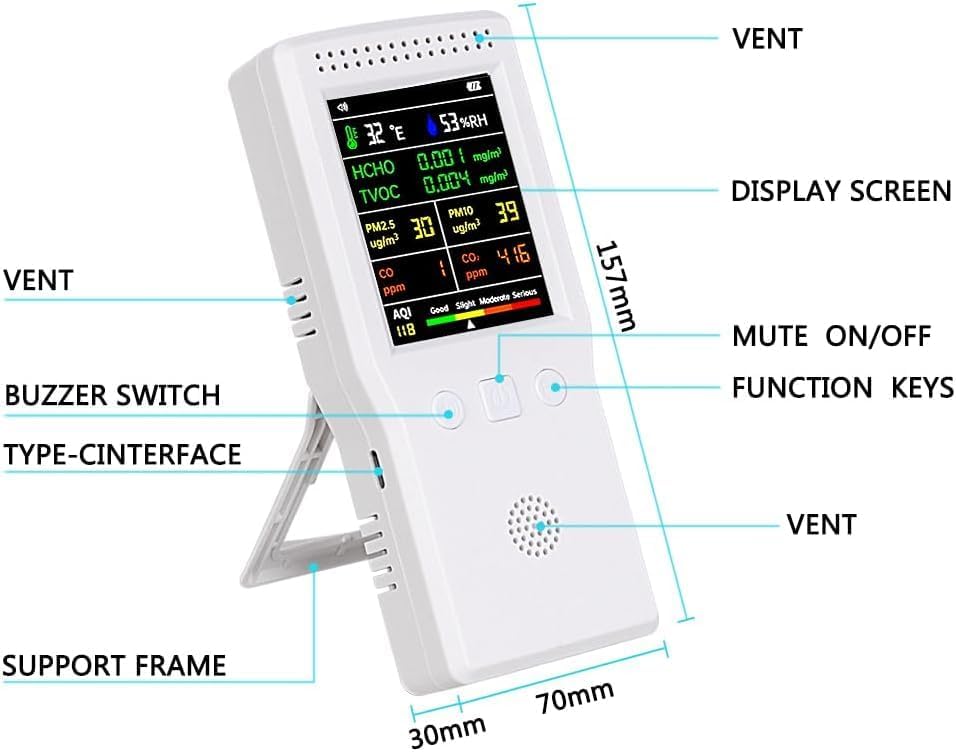 أجهزة مراقبة جودة الهواء - باستخدام مزيج من أجهزة استشعار الكيمياء الكهربائية وأشباه الموصلات ودرجة الحرارة والرطوبة، يستطيع كاشف جودة الهواء متعدد الاستخدامات هذا قياس مستويات ثاني أكسيد الكربون وأول أكسيد الكربون وHCHO وTVOC وPM2.5 وPM10 وAQI بدقة في الوقت الفعلي. بالإضافة إلى ذلك، فإنه يوفر قراءات شاملة لدرجة الحرارة والرطوبة