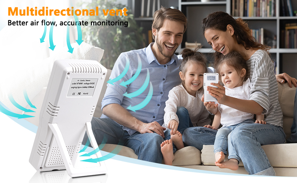 سهل الاستخدام - لا حاجة لتطبيقات معقدة أو اتصال Wi-Fi. بمجرد تفعيله، يقوم مقياس جودة الهواء تلقائيًا بقياس جودة الهواء المحيط لك. تم تصميم جهاز قياس جودة الهواء الداخلي لدينا من أجل البساطة، ويمكن لأي شخص تشغيله في أي مكان