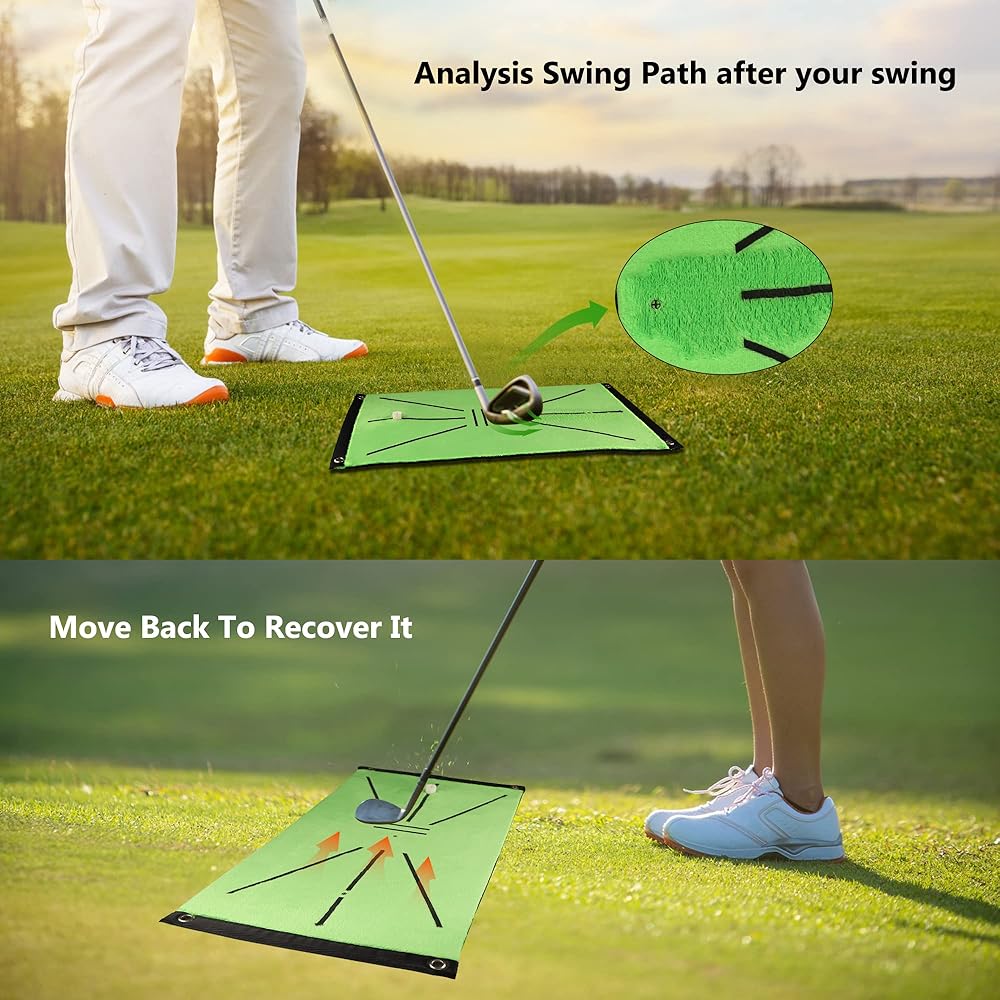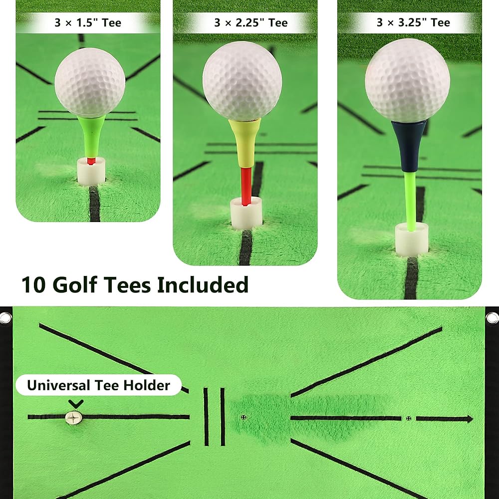 تصميم مبتكر 2 في 1 - تتميز حصيرة ضرب الجولف المطورة من Asyxstar بتعليقات مسار التأرجح المرئي ووظائف التيشيرت. يوفر دليل المحاذاة المتقدم دليلاً مرئيًا لمسار رأس مضرب الجولف وتأثيره. يمكن لسطح التأثير أن يتتبع مسار التأرجح الخاص بك ويمكنك تحليل مسار التأرجح وتصحيحه. تحتوي سجادة تدريب الجولف Asyxstar أيضًا على حامل تي شيرت مطاطي عالمي، والذي يمكن استخدامه للتدريب على تي شيرت الجولف للعثور على الشعور المناسب! أيضًا 9 تيشيرتات جولف إضافية (3*1.5 بوصة، 3*2.25 بوصة، 3*3.25 بوصة).