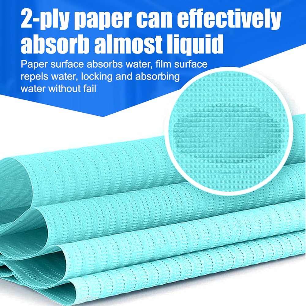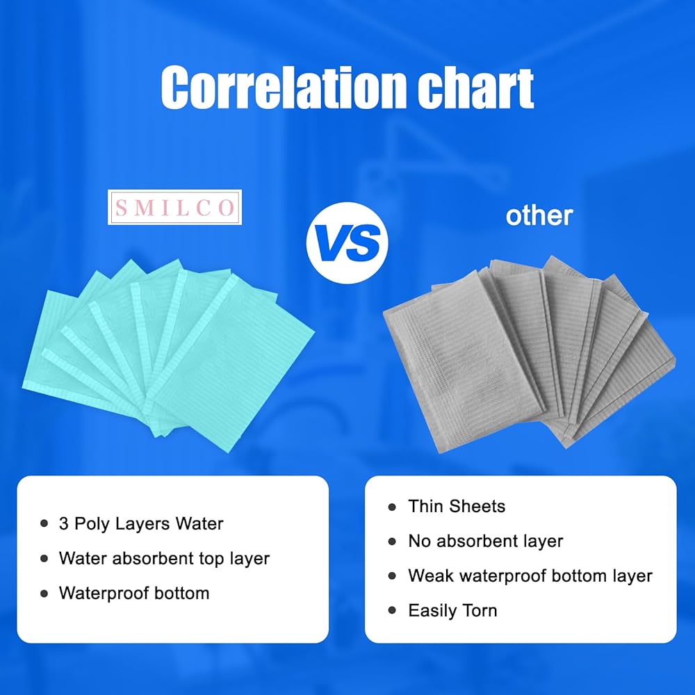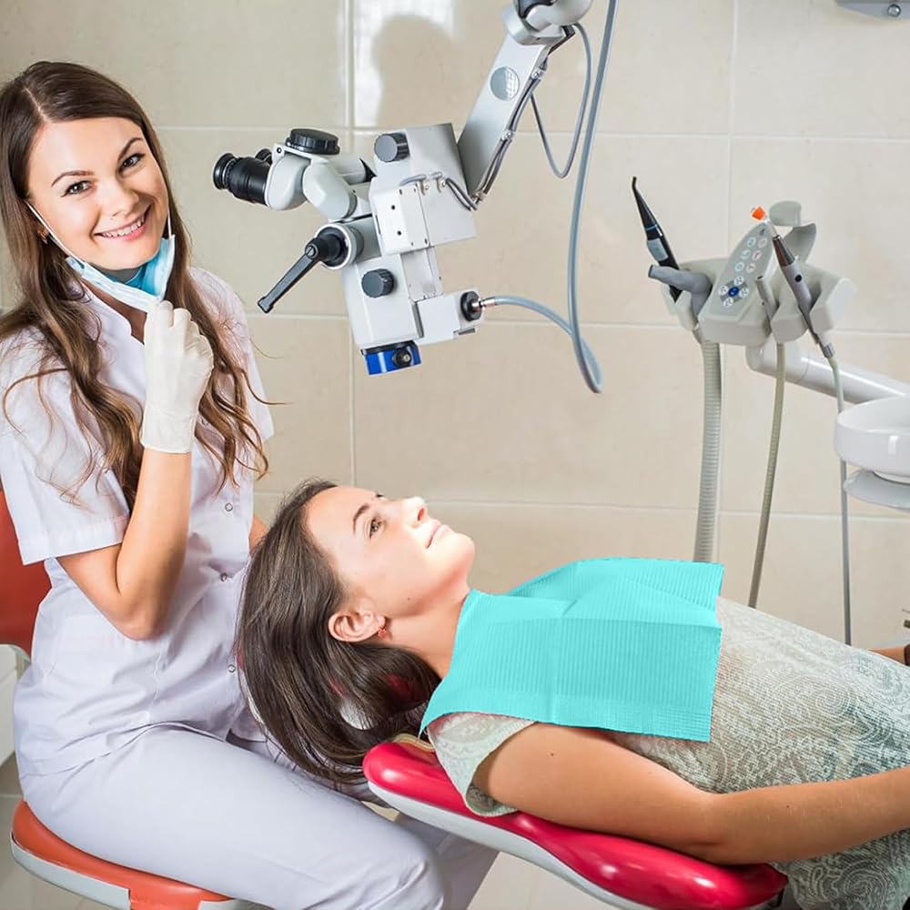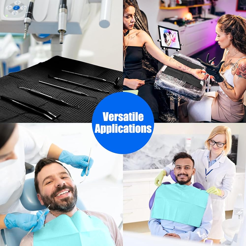 مرايل أسنان للاستعمال مرة واحدة مكونة من 3 طبقات: مريلة أسنان سوداء مقاومة للماء مصنوعة من طبقتين من ورق لب الخشب وطبقة واحدة من البوليستر، ناعمة الملمس، ولكنها تضمن أيضًا قوتها ومتانتها. لا داعي للقلق من أن المريلة الورقية للأسنان سوف تتمزق بسهولة.