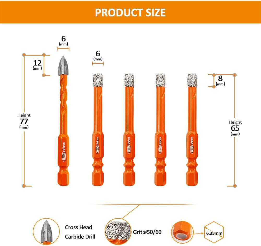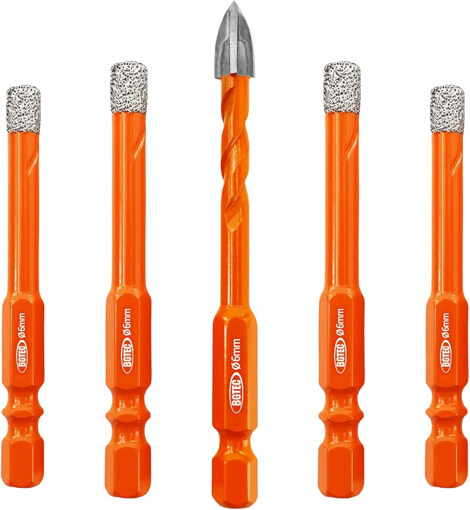 مجموعة لقم الثقب الماسي BGTEC لقم الثقب الأساسية مع ساق سداسية التغيير السريع، 5 قطع 1/4 بوصة * 4 لقمة مثقاب للبلاط + 1/4 بوصة لقمة مثقاب كربيد لبلاط السيراميك والبلاط والبلاط والرخام والجرانيت