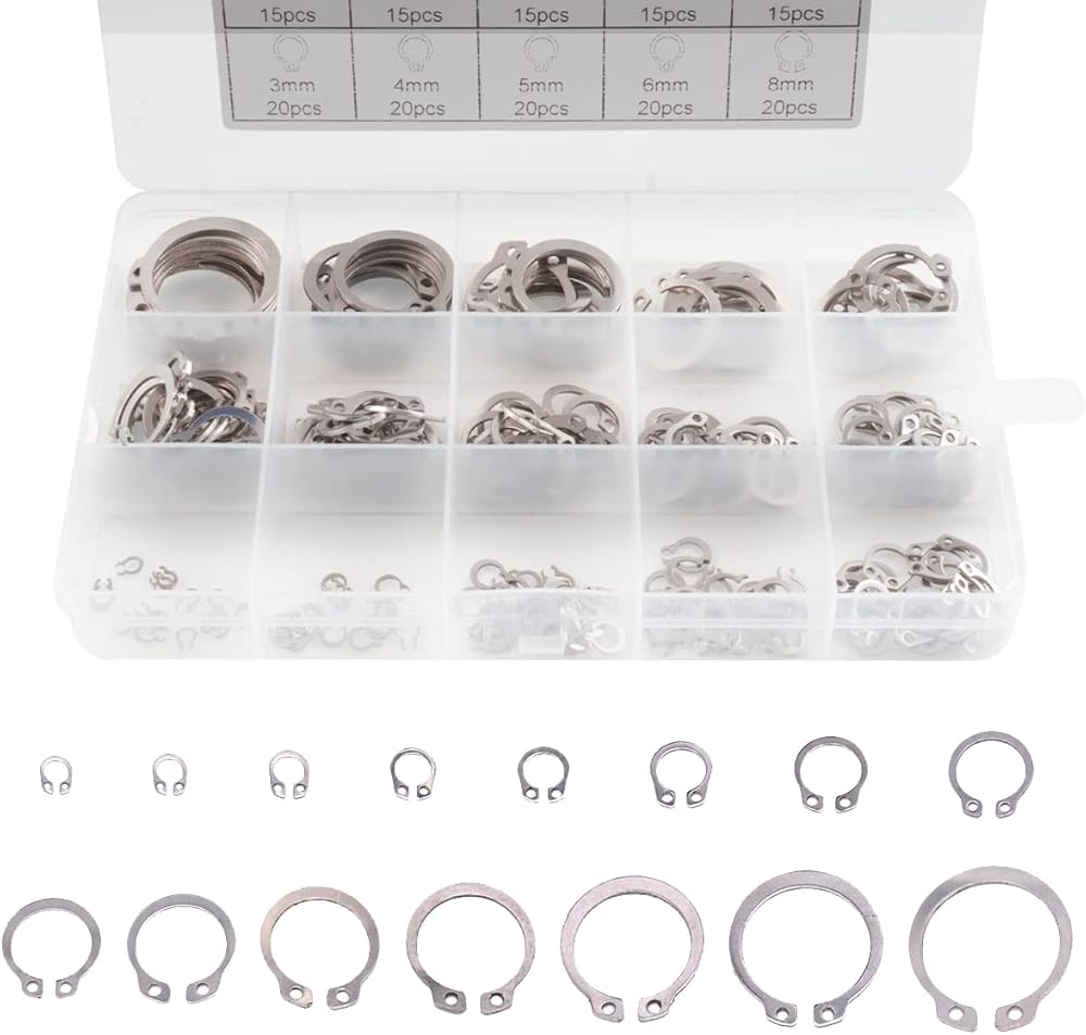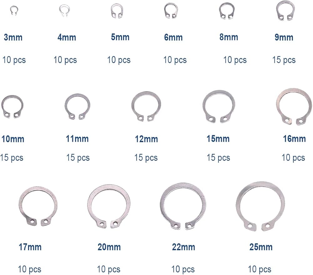 • تشتمل العبوة على: مجموعة متنوعة من حلقات الاحتفاظ بمشبك على شكل حرف C مكونة من 225 قطعة تتضمن 20 قطعة 3 مم، 20 قطعة 4 مم، 20 قطعة 5 مم، 20 قطعة 6 مم، 20 قطعة 8 مم، 15 قطعة 9 مم، 15 قطعة 10 مم، 15 قطعة 11 مم، 15 قطعة 12 مم، 15 قطعة 15 مم، 10 قطعة 16 مم، 10 قطع 17 ملم، 10 قطع 20 ملم، 10 قطع 22 ملم، 10 قطع 25 ملم.