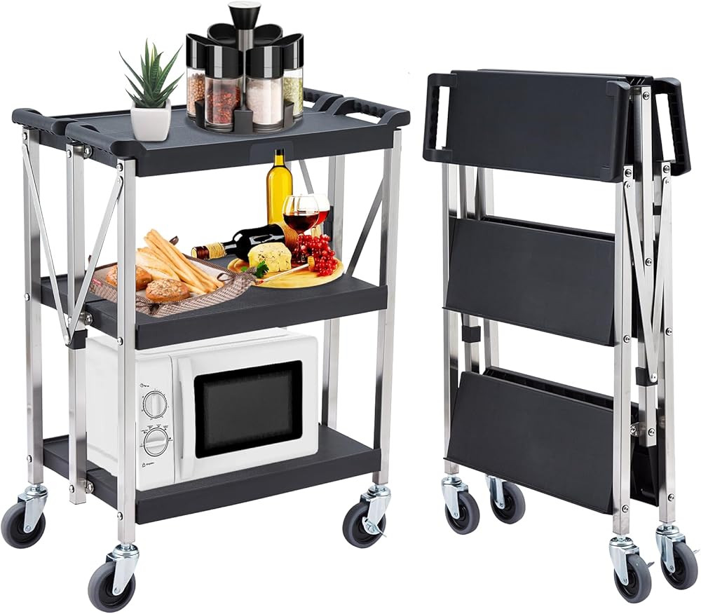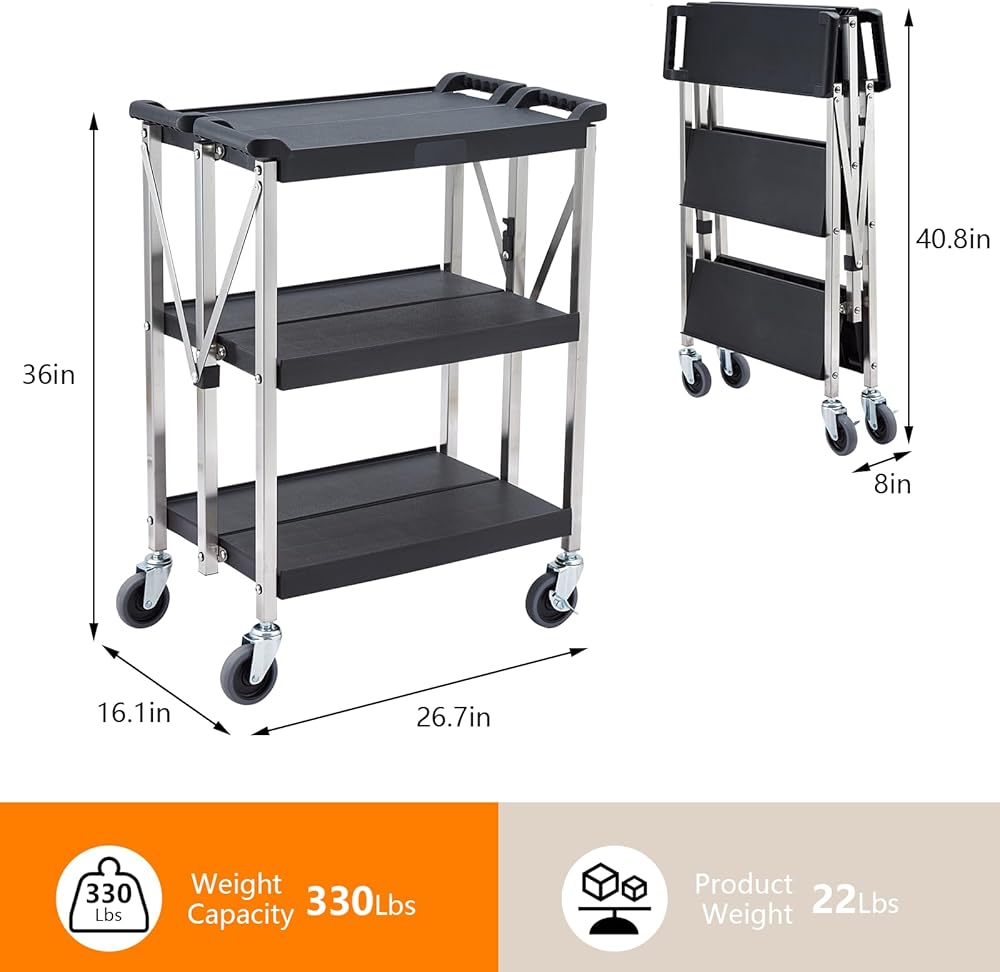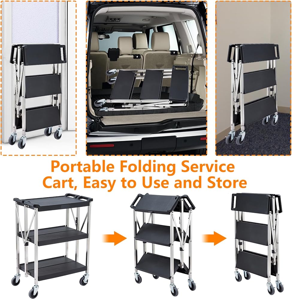 【Ergonomic Design】: The folding service tool cart is designed with ergonomic handles that effectively increase friction, making it easier to push the service cart. The three-tier design allows you to save time and energy by moving everything just once without having to make multiple runs.