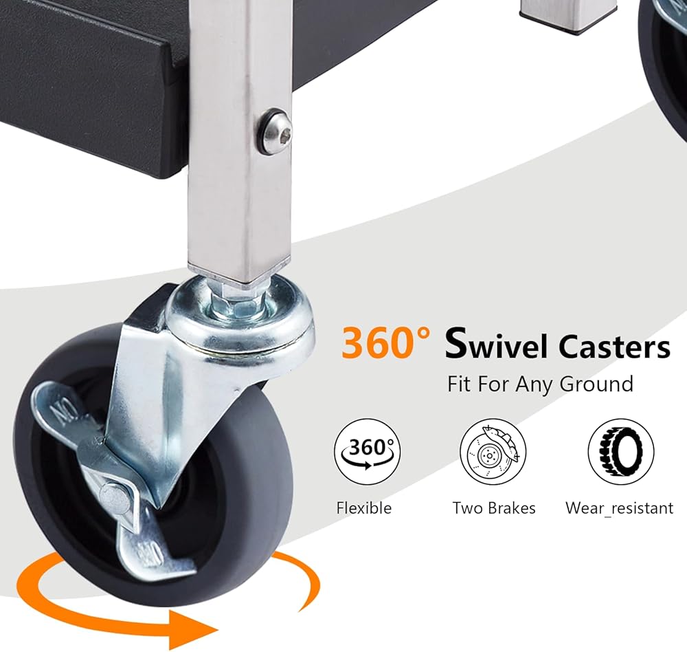 【Lockable Swivel Wheels】: Equipped with 4 heavy duty 360° swivel casters and 2 with side brakes. 2 lockable wheels allow a stable stop. High-quality PVC durable wheels can be used in all kind of ground. You can effortlessly move the utility cart smoothly and quietly even when loaded with heavy objects.