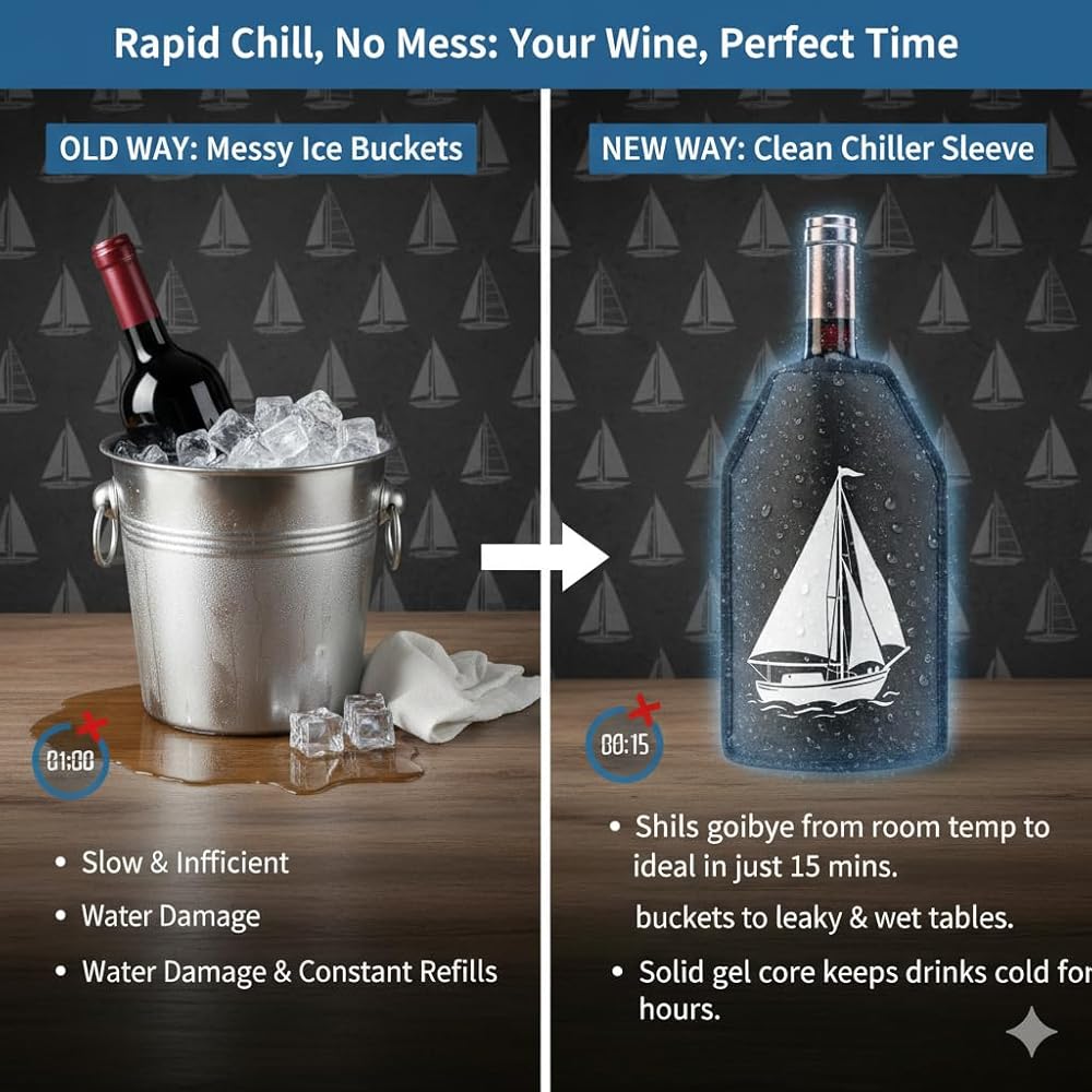 • NO MORE ICE BUCKET chillers -- Chills wine within 5 minutes and keeps it cold for hours! No need for an ice bucket! Keep your wine chilled to perfection! This portable wine cooler sleeve is great for any occasion. Fits a wide range of bottle sizes, ensuring your favorite beverages stay perfectly chilled.