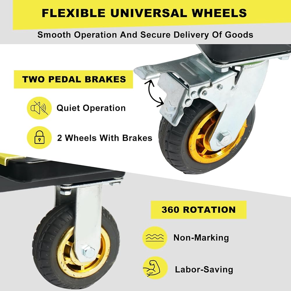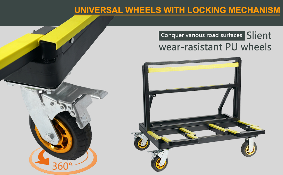 4 عجلات مطاطية: تحتوي عربة اللوحة على أربع عجلات مطاطية شديدة التحمل مقاس 15.24 سم تجعل من السهل التحرك على أي سطح. عجلتان ثابتتان وعجلتان دوارتان بتصميم فرامل تسمح لك بتحريك العربة في أي اتجاه تريده أو ركنها أينما تريد.