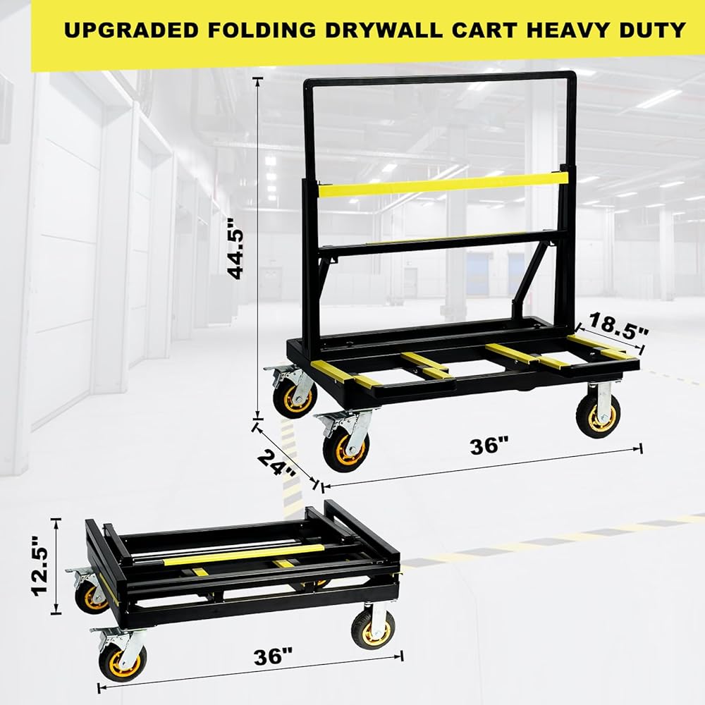 【قابلة للطي وسهلة التخزين】حجم متوسط لسهولة النقل ولا يمكن قلبها بسهولة، يبلغ مقاس عربة الحوائط الجافة هذه 91.44 سم طولًا × 60.96 سم عرضًا × 111.43 سم ارتفاعًا وتزن 59 رطلاً. يمكن طي عربة الحوائط الجافة هذه بقياس 91.44 سم طولًا × 60.96 سم. عرض × 18.5 بوصة ارتفاع وسهل التخزين للغاية.