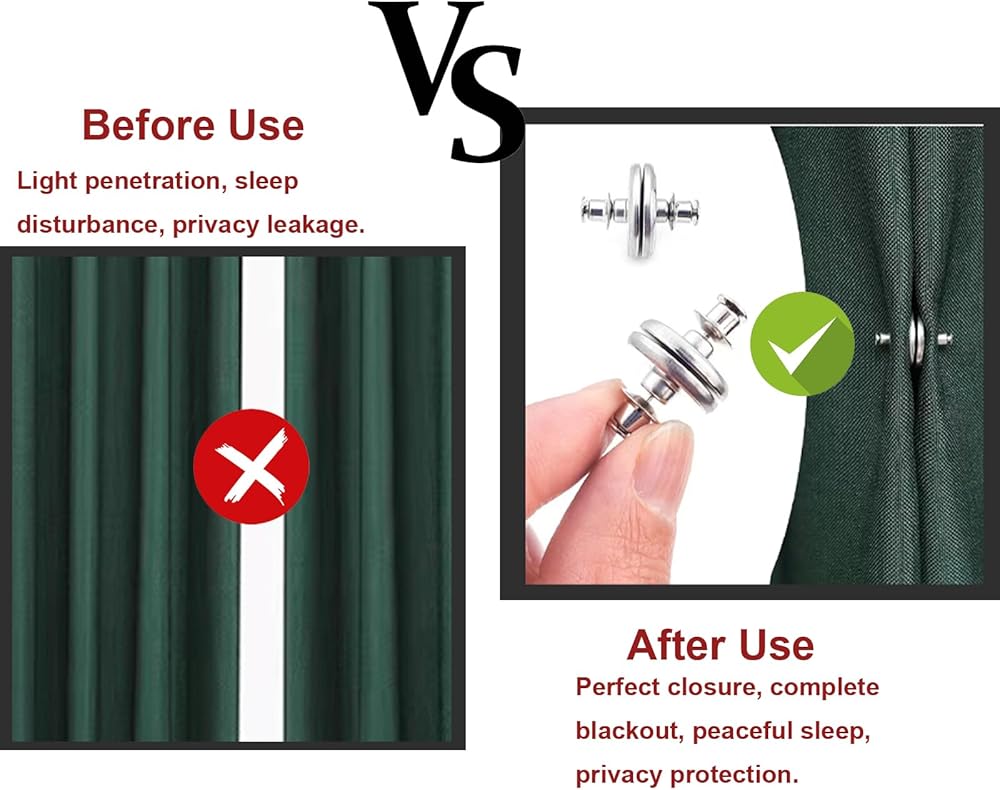 【Enhanced Curtain Stability】Say goodbye to flimsy curtains that flutter in the breeze or let in unwanted sunlight. These clips provide additional magnetic force, anchoring your curtains in place and maintaining the perfect position. They snugly attach to each other, creating a strong connection that blocks out light for enhanced privacy.