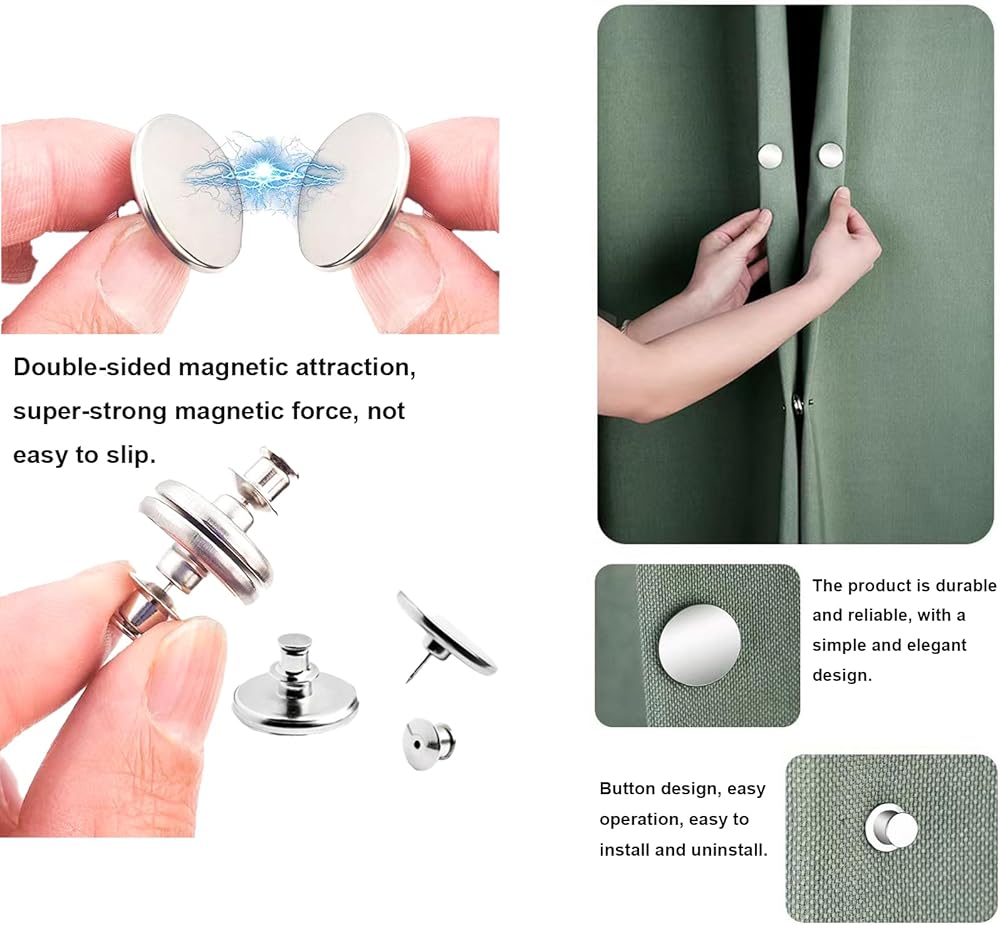 【Versatile Usage Options】Beyond curtain fastening, these magnetic clips find utility in various scenarios, such as securing shower curtains, acting as refrigerator magnets, whiteboard magnets, and sealing food bags. They can even serve as stylish waistband buttons for your pants.