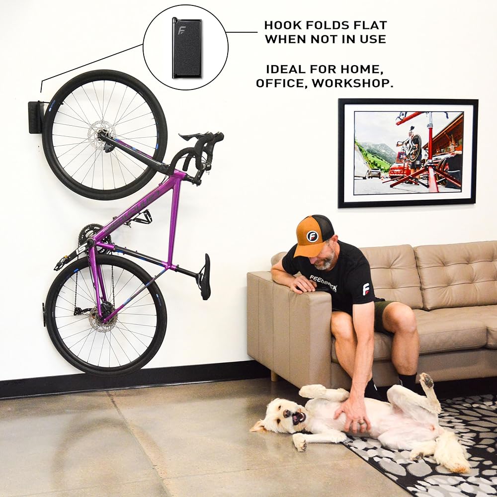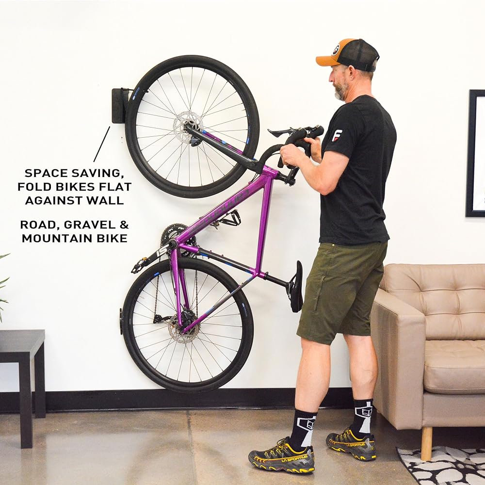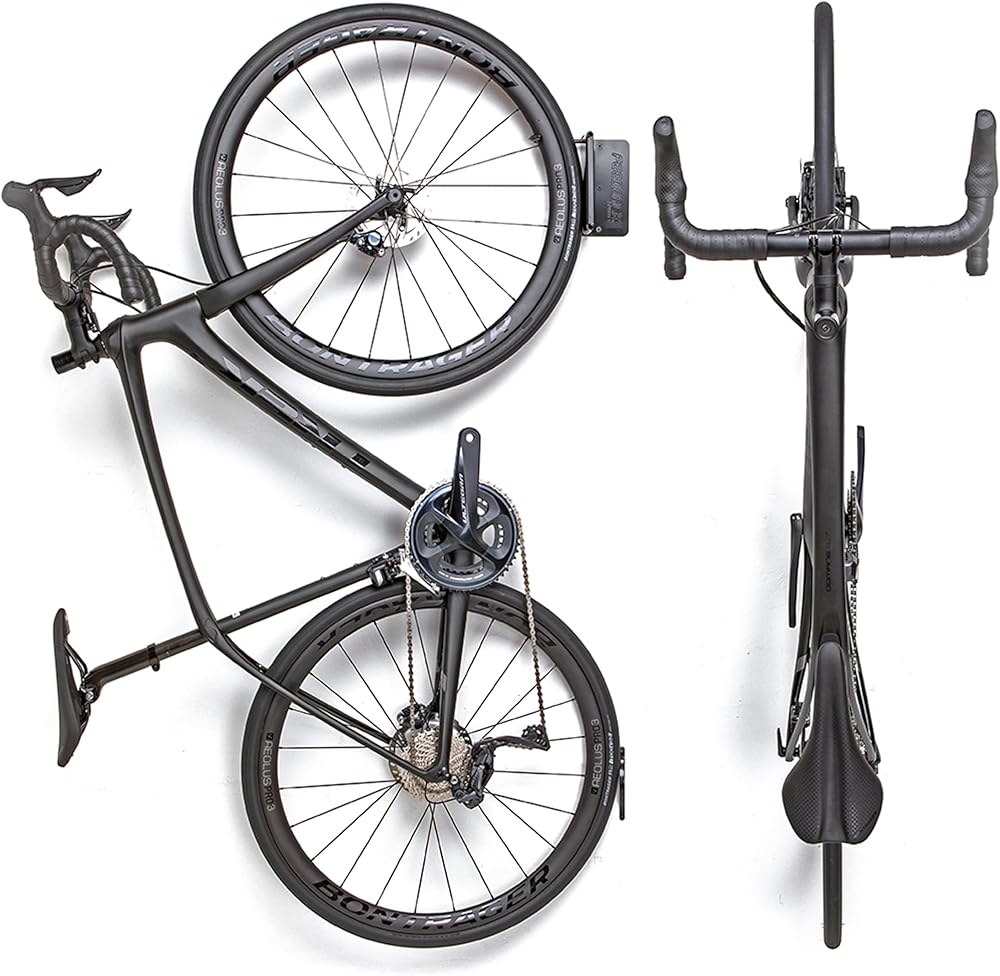 SPACE SAVING: Hinged design allows for your bike to be stored flat against the wall in a configured direction. Maximizes available bicycle storage space. Hook can be folded away when not in use.