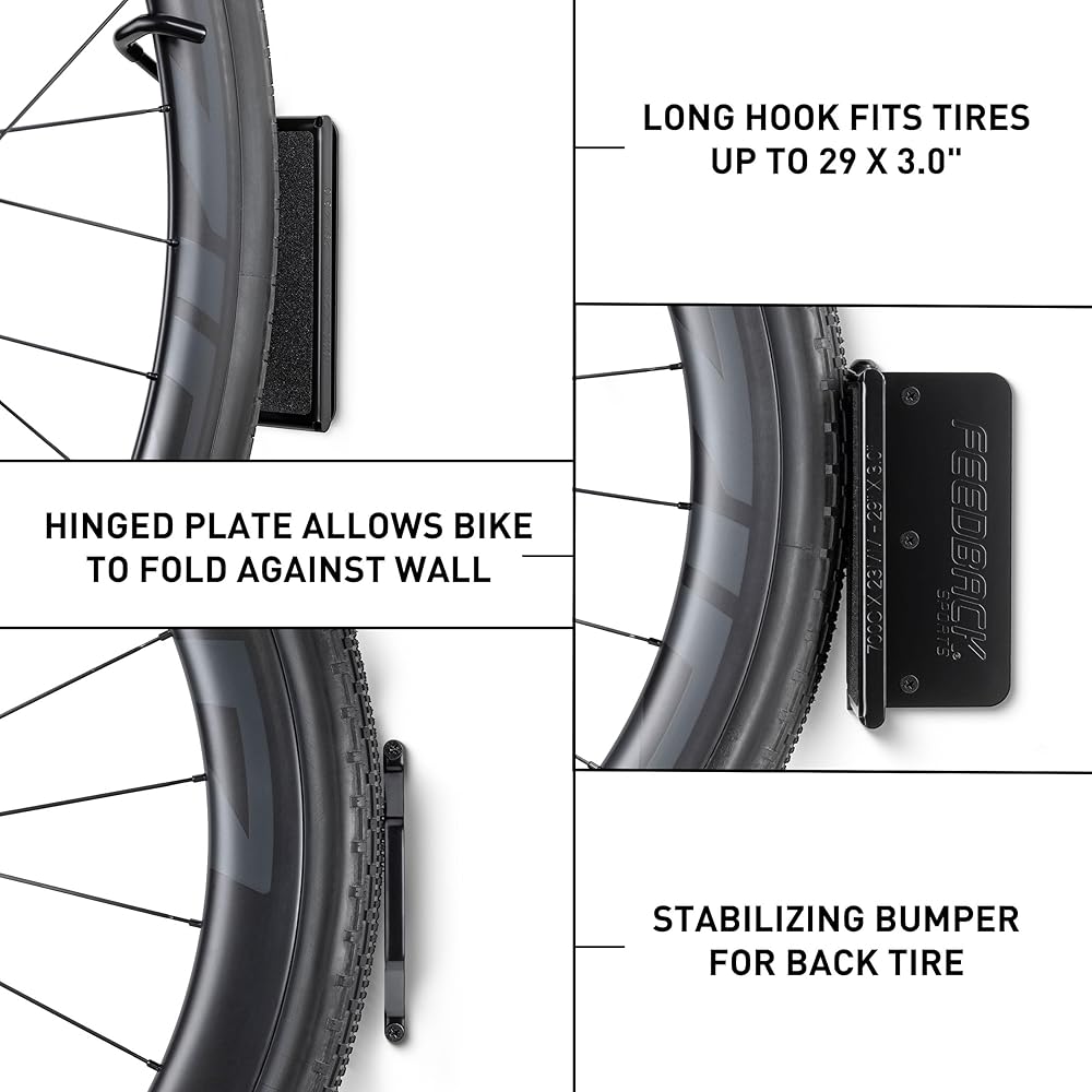 Updated with a stiffer, stronger body and a longer wheel hook, the Velo Hinge 2.0 is made for modern bikes of all types. Updated to easily fit bigger, wider wheels and tires, the familiar function of our patented Velo Hinge design allows bikes to pivot for easy access to neighboring bikes plus permits flat, space-saving bike storage along a wall. New grip tape on the tire contact plate adds stability. When not in use, the hook folds into the hinge for a clean aesthetic. More than just a standard wall hook for bikes, the Velo Hinge is an innovative and elegant bike storage hook on a hinged plate to hang your bike by the front wheel and also allow it to safely swing sideways, to rest flat along the wall. Fitting almost any bike and swinging either left or right to match your needs, the Velo Hinge maximizes your space while showing love to your bicycles and your living space. And when not in use, it tucks away so you'll hardly know its there. Long, angled wheel hook accommodates deep profile road wheels and wide mountain bike rims/tires. 700C X23mm - 29" X 3.0". Mounts to any standard, wood framed wall stud. (Consult a hardware store for mounting options to masonry walls or steel stud framed walls.)