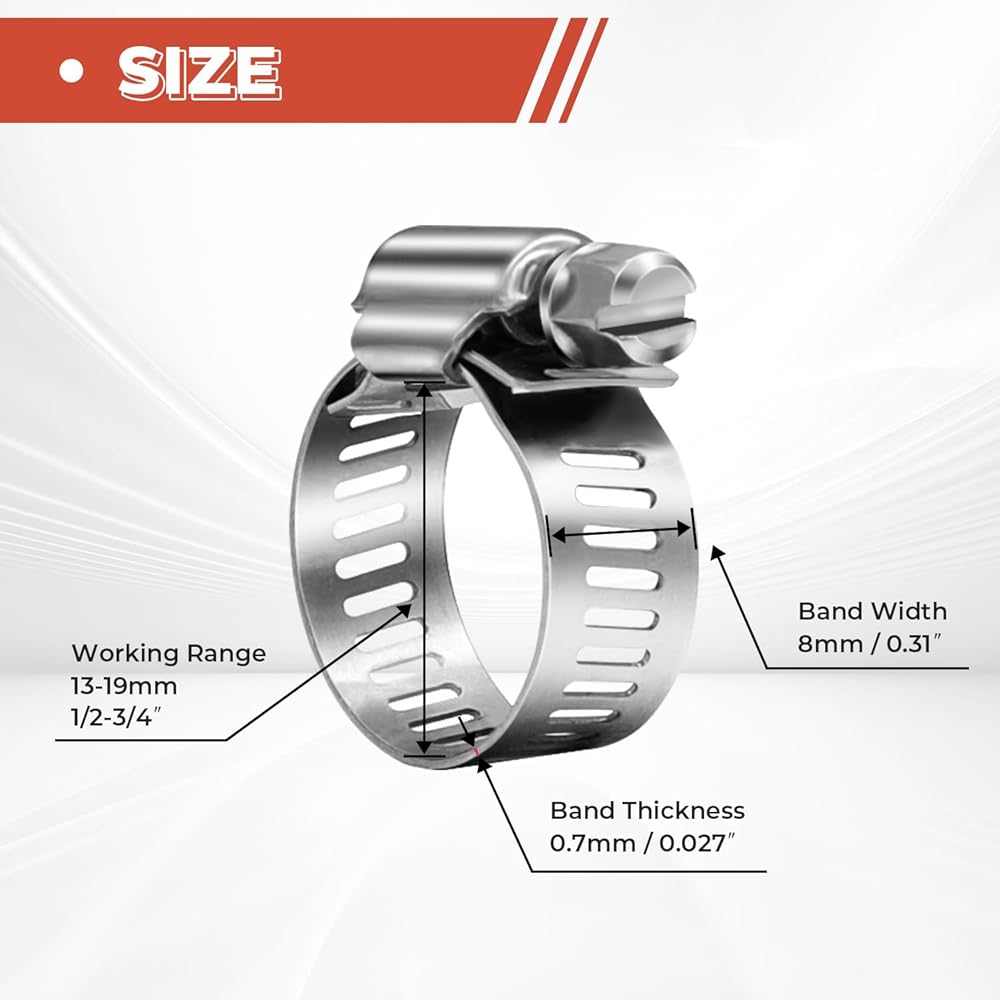 • تصميم قابل للتعديل: مع نطاق قابل للتعديل من 1/2 بوصة - 3/4 بوصة (13-19 مم)، توفر مشابك الخرطوم هذه التنوع والمرونة. يمكن شدها أو فكها بسهولة لاستيعاب أحجام مختلفة من الخراطيم أو الأنابيب، مما يوفر ملاءمة آمنة ومحكمة.