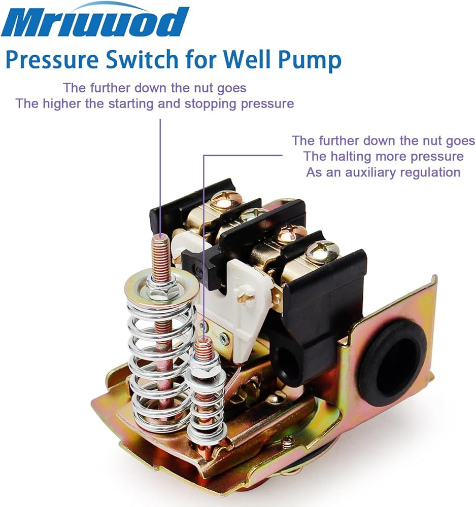 • مفتاح ضغط قابل للتعديل: هذا مفتاح تحكم في ضغط مضخة المياه للتحكم في الضغط، لتحقيق ضغط مياه مثالي في كل مرة. يعمل نطاق ضبط الضغط 30-50 رطل لكل بوصة مربعة على تنشيط مضخة مياه تعمل بالكهرباء داخل دائرة الطاقة عند الوصول إلى عتبات الارتفاع والانخفاض القابلة للتعديل.