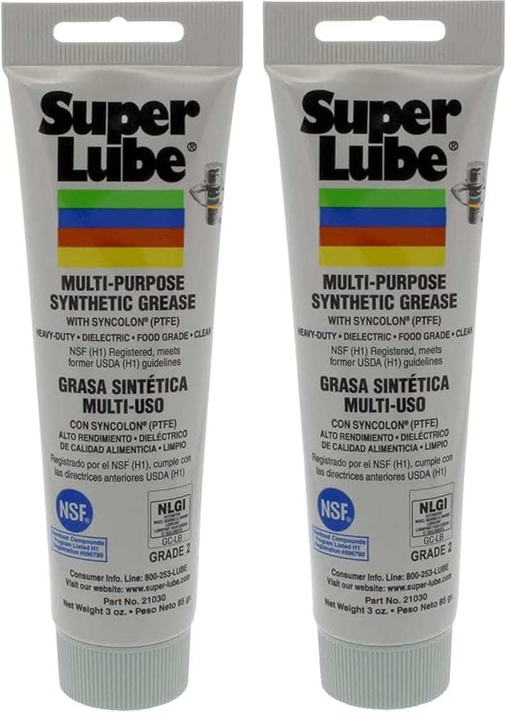 Pack of 2 - Super Lube Grease is a patented synthetic, multi-purpose lubricant with Syncolon (PTFE). Synthetic base fluids and the addition of PTFE micro powders combine to form a premium lubricant that provides protection against friction, wear, rust and corrosion over a temperature range of -45°F to +450°F. Super Lube Grease is a USDA/NSF listed Food Grade lubricant NLGI-2, rated H-1 for incidental food contact, and will not run, drip, melt or separate. Compatible with most other lubricants, Super Lube outlasts conventional greases 3–4 times.