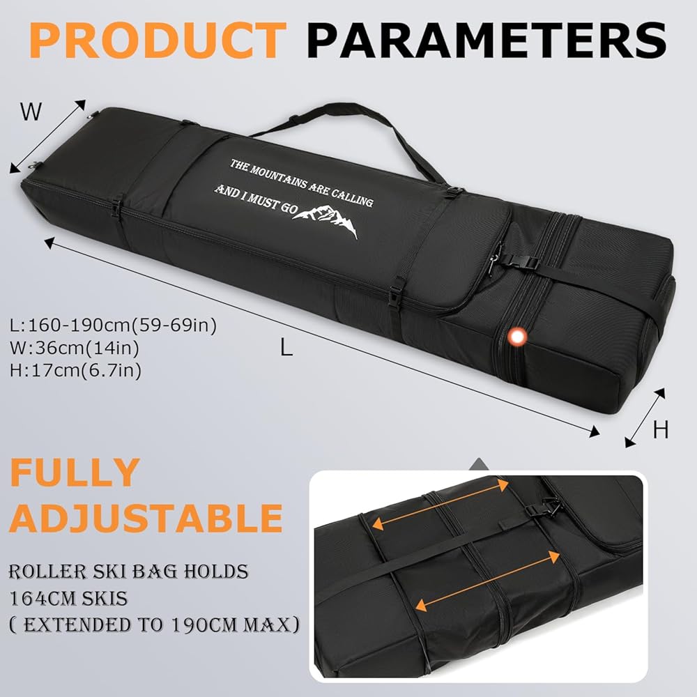 🏂【جيوب تخزين إضافية】--بالإضافة إلى مساحة واسعة للزلاجات والأعمدة، توفر هذه الحقيبة خيارات تخزين إضافية. جيب معزول في الأعلى لتخزين مشروباتك والحفاظ عليها في درجة الحرارة الخاصة بها؛ الجيب الأمامي الكبير مثالي لتخزين الأشياء الصغيرة مثل القفازات أو النظارات أو أدوات الضبط، مما يساعدك على الحفاظ على أدواتك منظمة ويمكن الوصول إليها بسهولة.