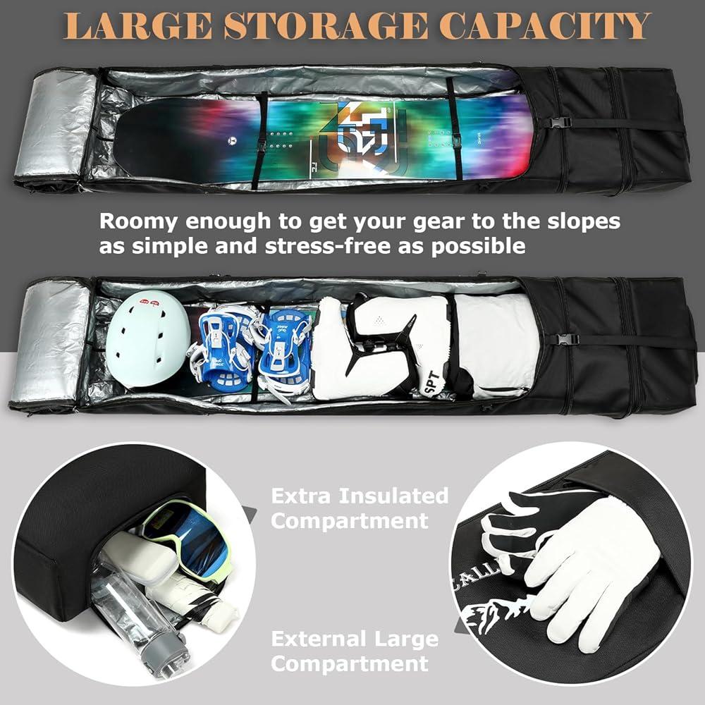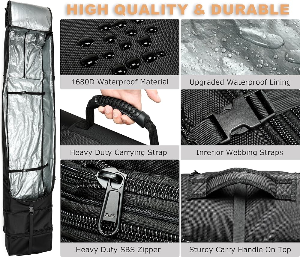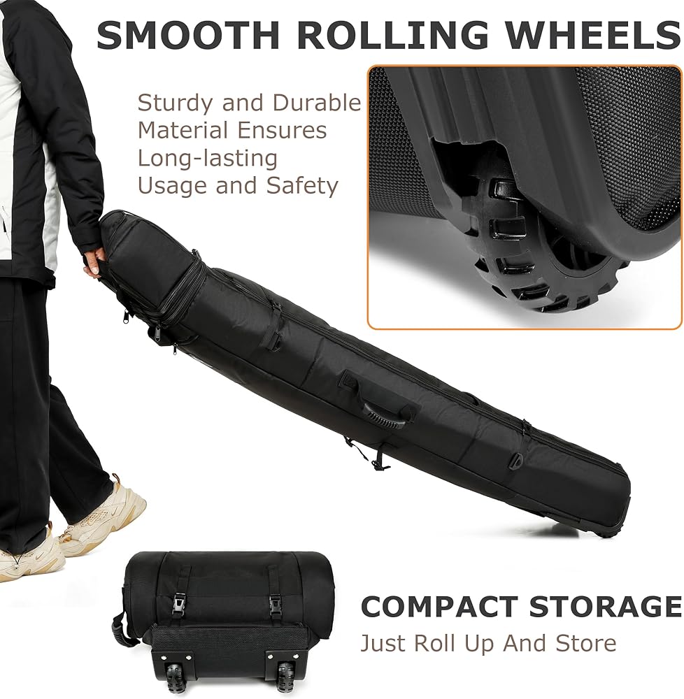 🏂【عجلات شديدة التحمل لسهولة التدحرج】--قل وداعًا لسحب حقيبة التزلج على الجليد الخاصة بك عبر الثلج والطقس السيئ وابدأ مغامراتك الشتوية بالطريقة الصحيحة. عجلات اليوريثان عالية الجودة لجميع التضاريس تجعل نقل العديد من الألواح والأحذية والأربطة ومعدات التزلج على الجليد أمرًا سهلاً حتى تتمكن من السفر بأناقة.