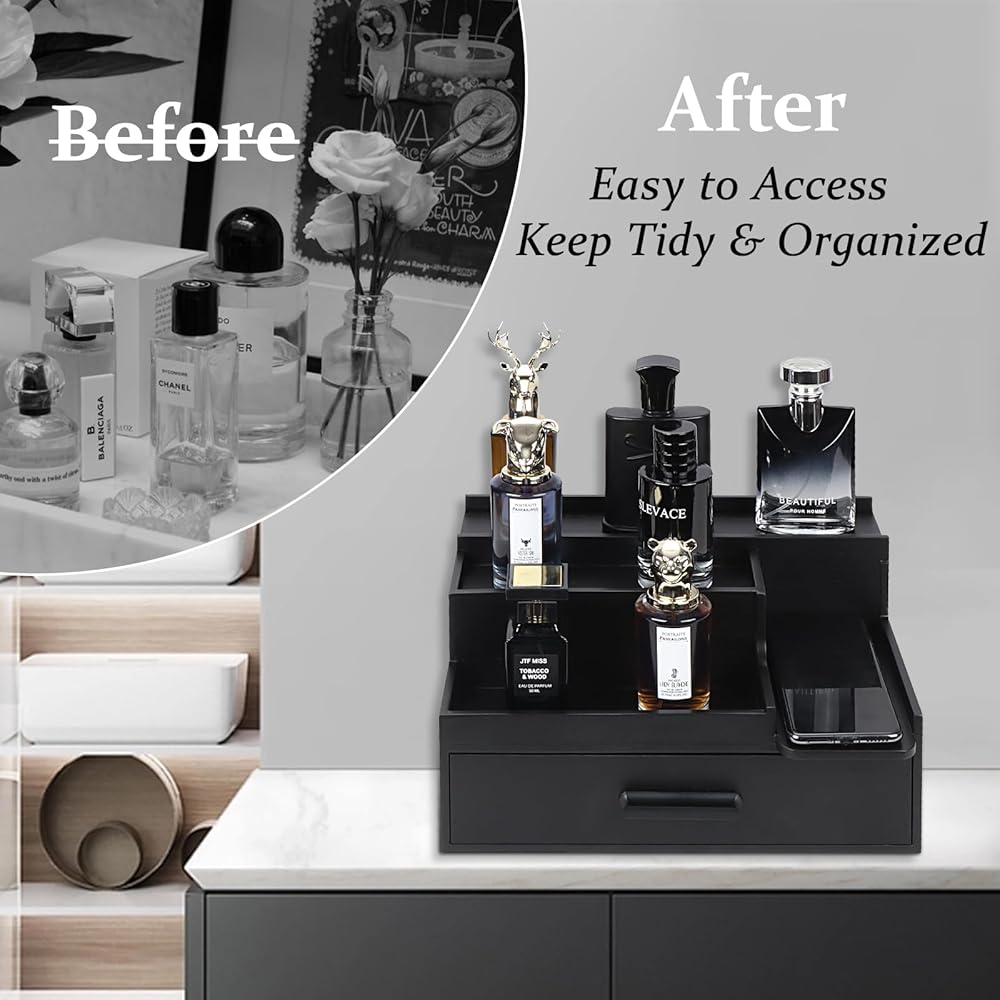 💝【موفر للمساحة بشكل مذهل】يجمع منظم الكولونيا المكون من 3 طبقات مع العملي والزخرفي. لا تقوم فقط بتنظيم وعرض عطرك وإكسسواراتك اليومية، وتسهيل الوصول إليها، بل تضفي أيضًا لمسة من الأناقة على طاولة الزينة الخاصة بك.
