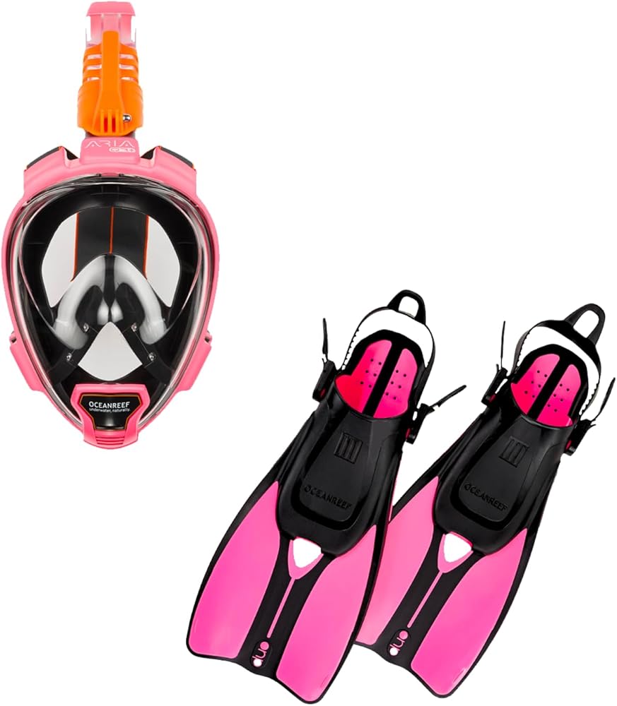 OCEAN REEF - Aria QR+ & DUO II Fins - Full Face Snorkeling Mask and Fins Package - Unisex - 7 Colors and 3 Taglie diverse ARIA QR+ , OCEAN REEF's redesigned full face snorkeling mask with more technical look. Swiveling quick release buckle aids in better fit by allowing strap to adjust to your face. Large buckles allow for easy disconnection of strap for removal. ARIA QR+ comes with action camera mount and a cool Bag for easy carrying that is reusable as a Dry Bag and a Snorkeling Signaling Buoy. The new design conveys the high quality of the product - Designed and MADE in Italy. OCEAN REEF - Duo Fins - For Snorkeling, Maximum Comfort and Lightweight for Easy Packing and Traveling - Unisex. Ensure the best experience with Ocean Reef's Duo II Fins, comfortable fins with comfortable foot pocket for most foot sizes 4.5-13. These lightweight, easy-to-wear fins give you maximum comfort thanks to ultra-soft high quality silicone flat-foot pocket. Easy to wearing with integrated one-hand don/release ring system designed into the anatomical rubber heel piece.