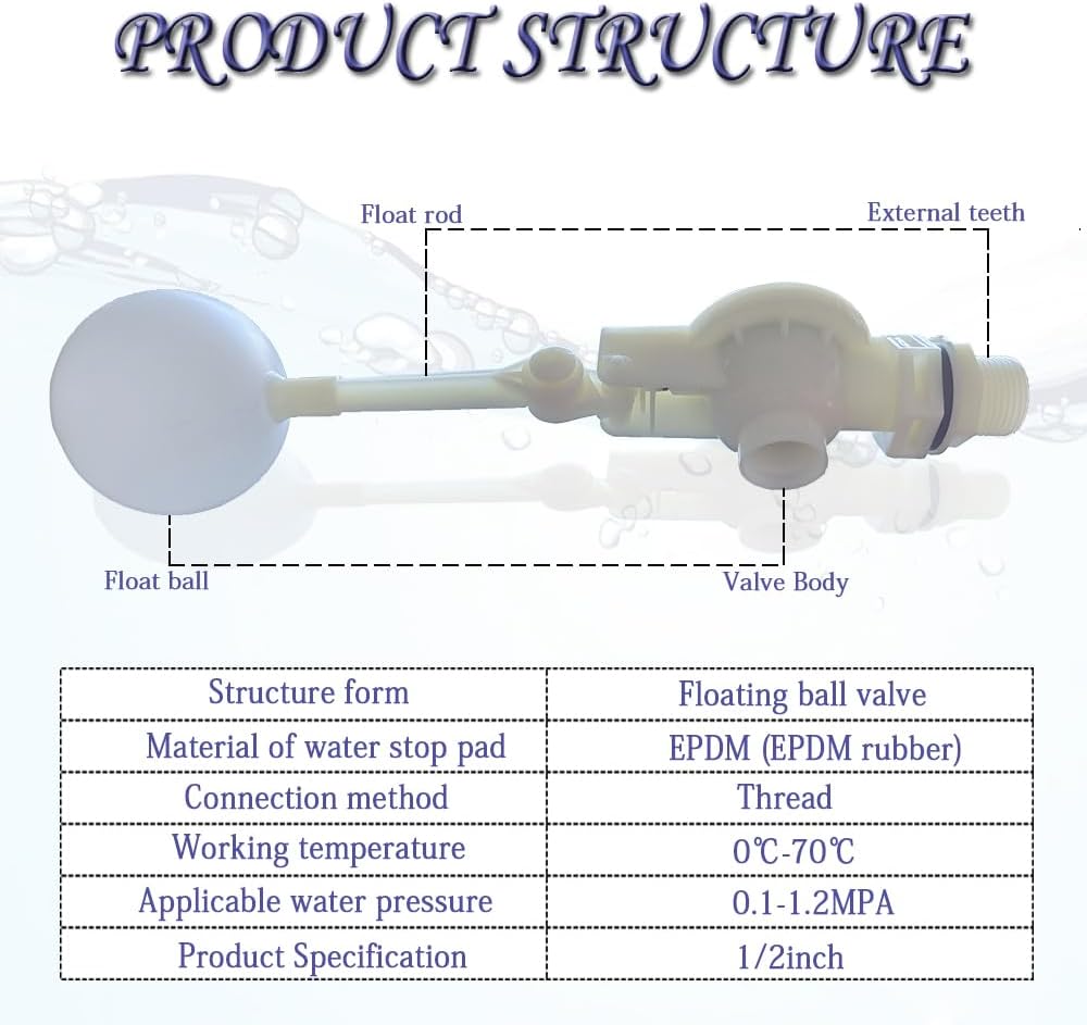 • 【الحجم والمواد】يمكنك توصيل الصمامات العائمة بأنبوب الإمداد مقاس 1/2 بوصة، ويمكنك تركيب عدد مناسب من صمامات تعويم المياه وفقًا لحجم خزان المياه لتلبية احتياجاتك في المواقف المختلفة؛ كرة صمام تعويم الماء مصنوعة من مادة البولي إيثيلين، والأجزاء الأخرى مصنوعة من مادة بوم، ومقاومة لدرجات الحرارة المنخفضة ومقاومة للتآكل، ومتينة وغير سامة، ويمكن أن تخدمك لفترة طويلة.