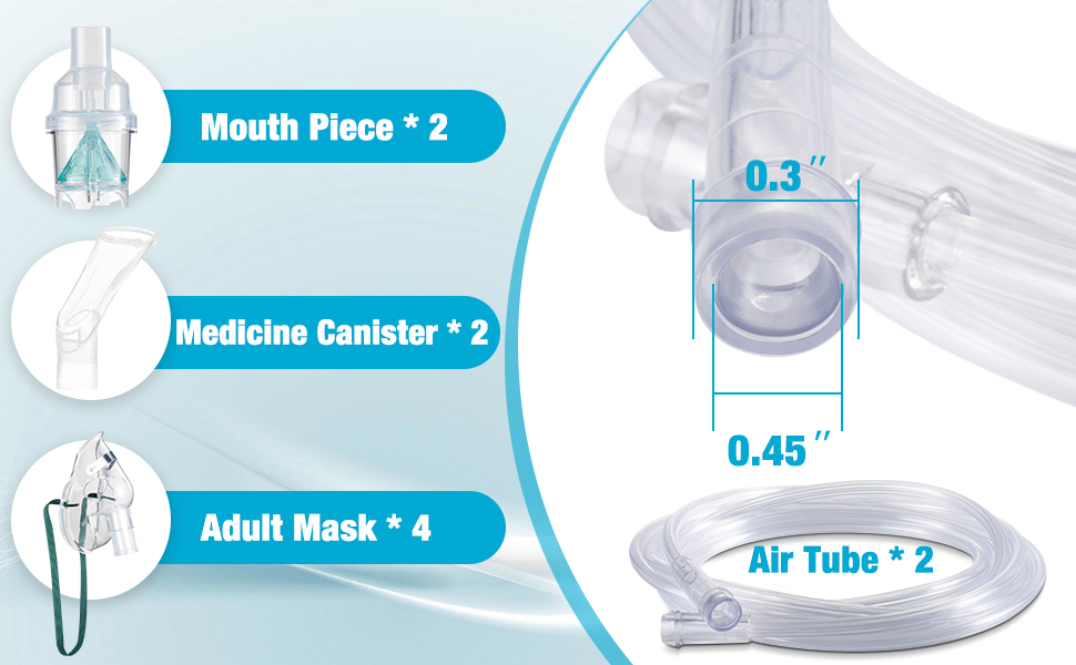 • 【تفاصيل التعبئة】: تتضمن مجموعتين من الملحقات البديلة: 4*قناع للكبار؛ 2 * أنبوب هواء؛ 2 × قطعة فم؛ 2 * علبة دواء.