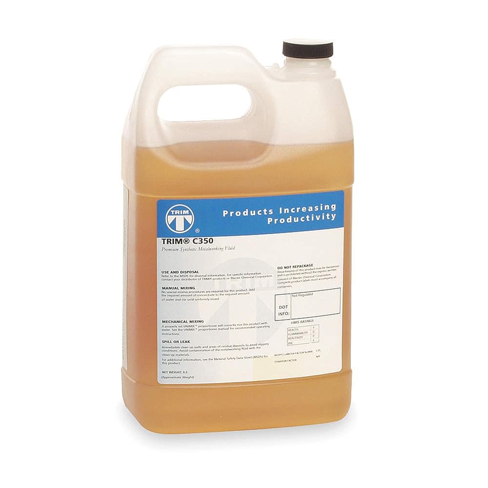 TRIM C350 is a synthetic or chemical coolant optimized for the chemical, environmental, and machining requirements of the North American aerospace industry. C350 uses the best of the new ester technology to yield a very high performance, easy to use and maintain metal removal fluid. The combination of the proven synthetic ester technology and nonchlorinated EP package produce very high levels of usable lubricity at the point of cut. C350?s unique chemical formula allows superior, nonferrous corrosion prevention particularly on aerospace aluminum alloys.
