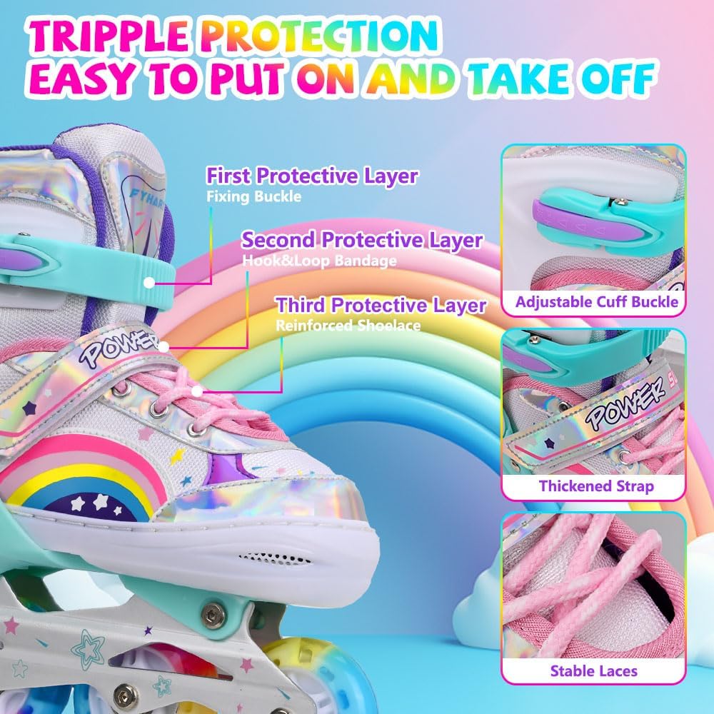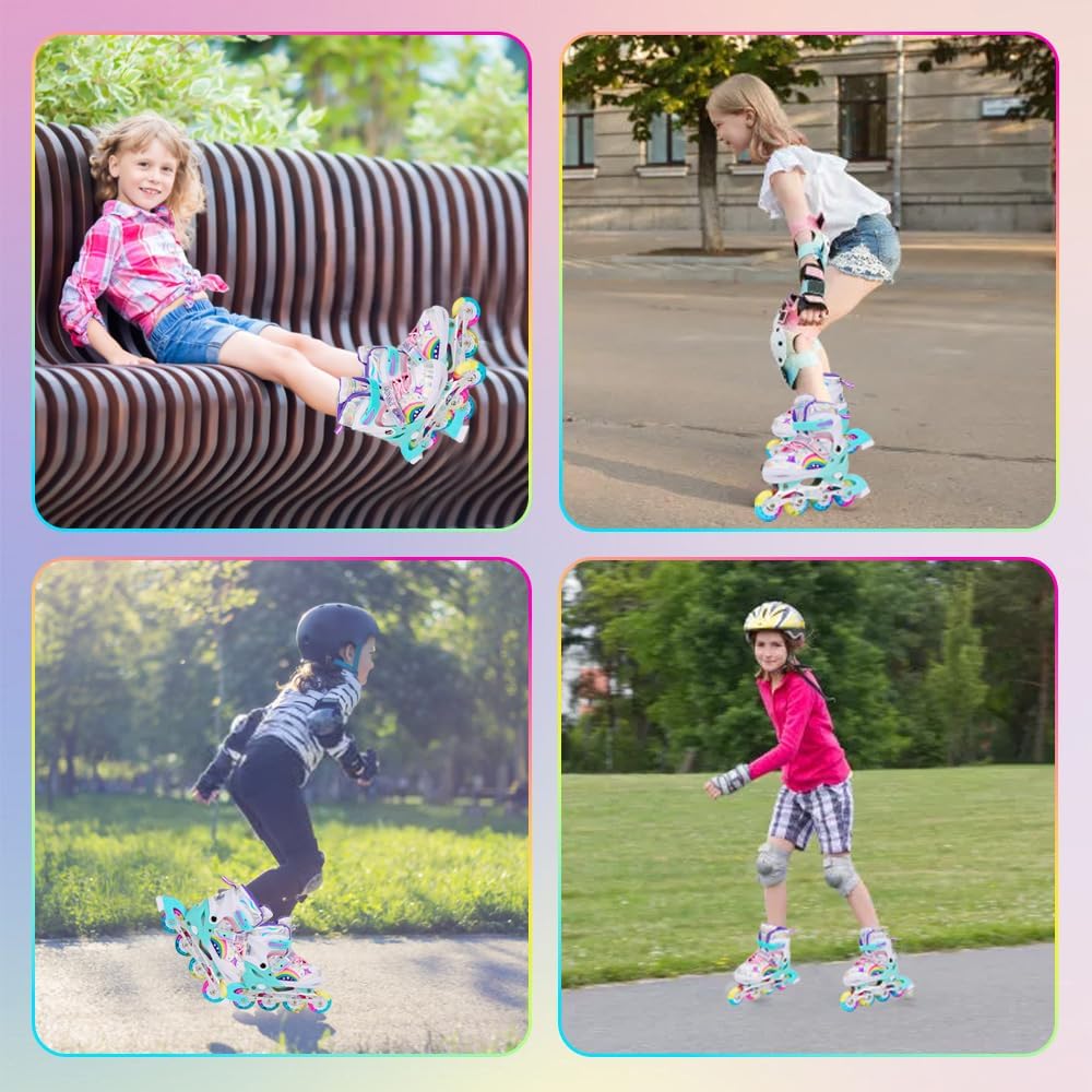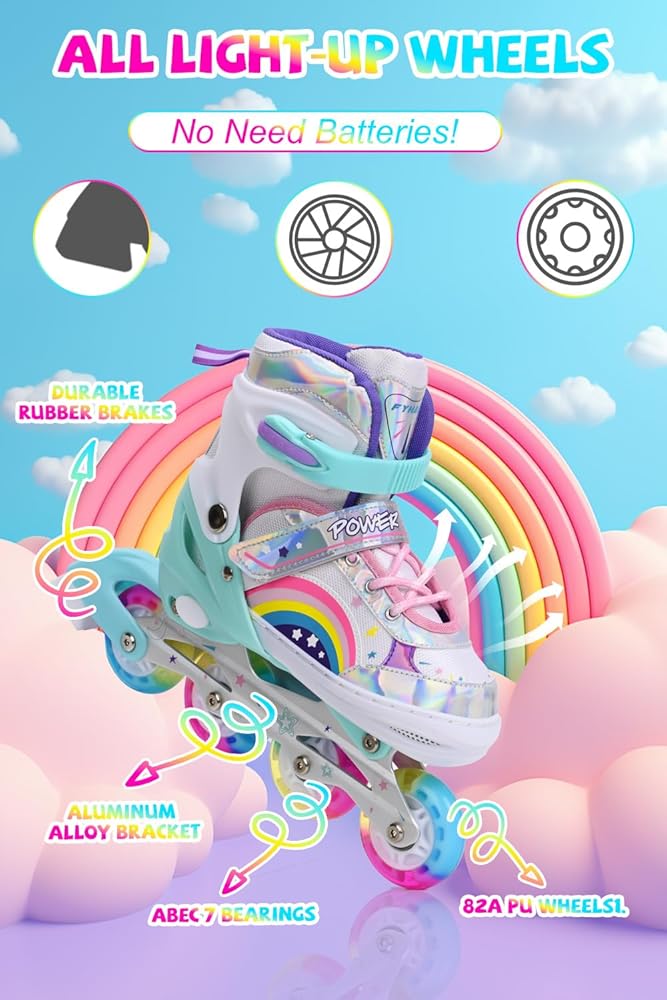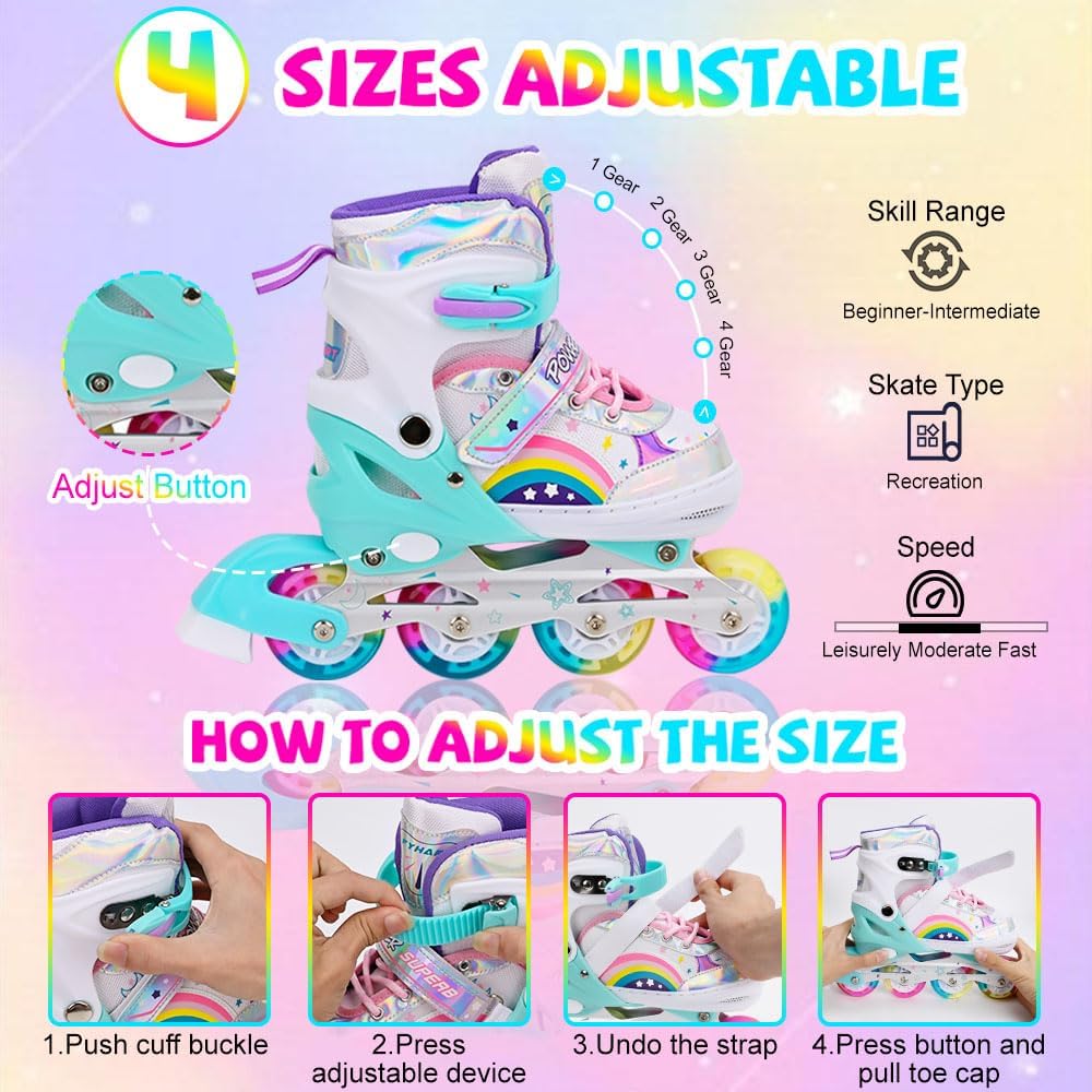 【زلاجات مضيئة ممتعة للفتيات】تنبعث عجلات التزلج المضمنة للفتيات ضوءًا ملونًا أثناء التزلج، جميلة جدًا ورائعة، ولا تحتاج إلى بطاريات لمنح طفلك تجربة تزلج رائعة وآمنة!