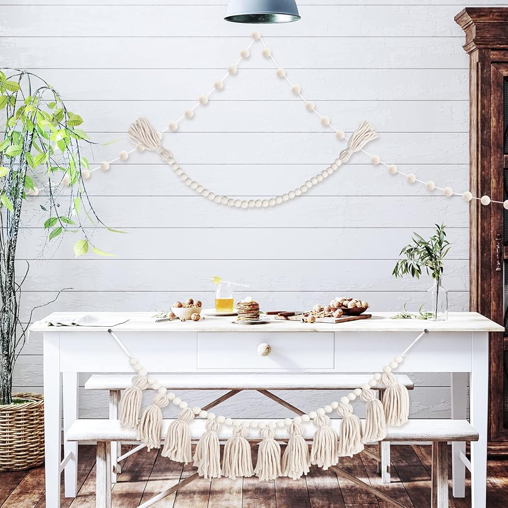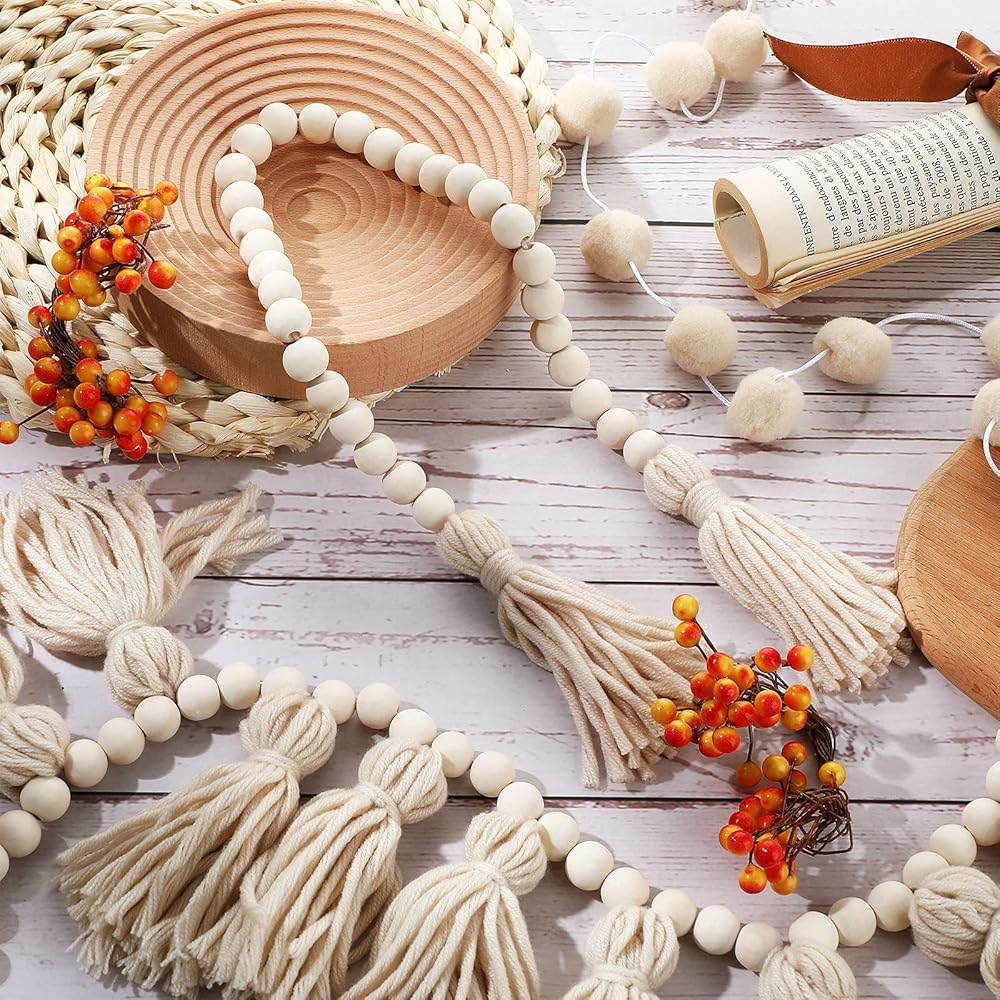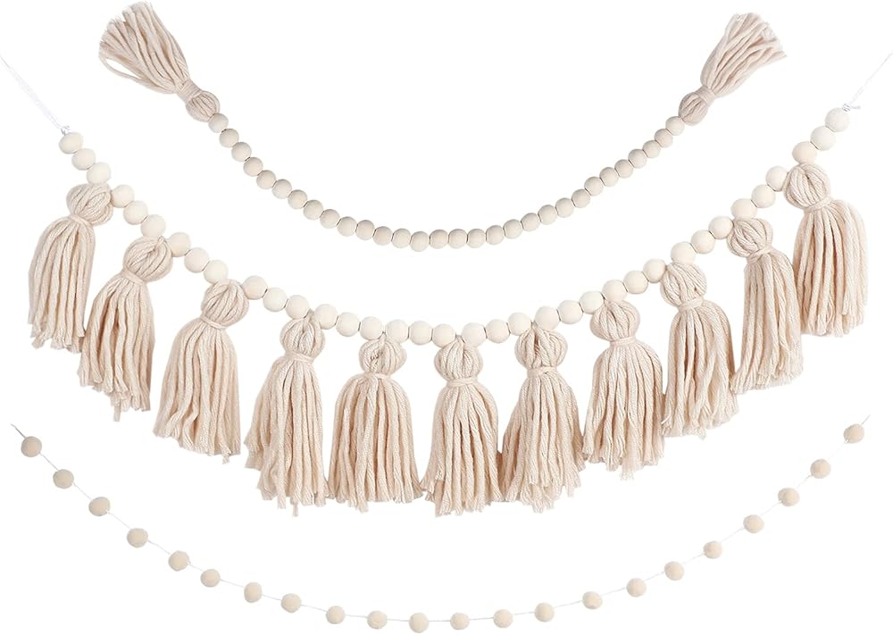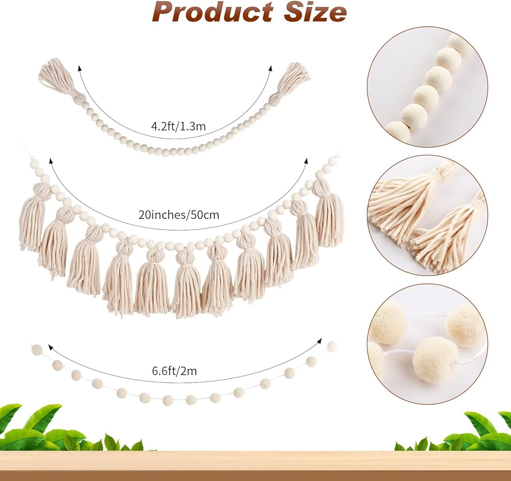 • Package includes: get 1 piece tassels garland with rope a length of about 40 inches, 1 piece pom pom garland with a length of about 79 inches, and 1 piece wood bead garland about 51 inches; Enough decorations make your room warmly and beautifully decorated to enhance the sense of atmosphere