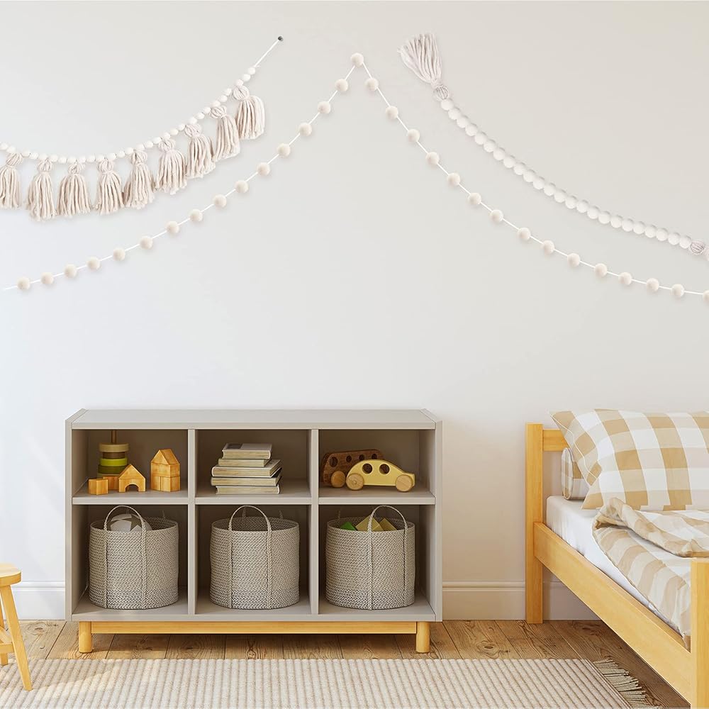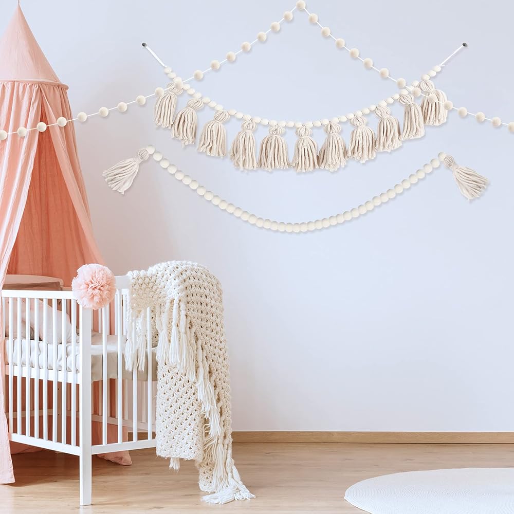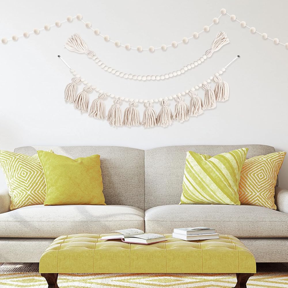 • Package includes: get 1 piece tassels garland with rope a length of about 40 inches, 1 piece pom pom garland with a length of about 79 inches, and 1 piece wood bead garland about 51 inches; Enough decorations make your room warmly and beautifully decorated to enhance the sense of atmosphere