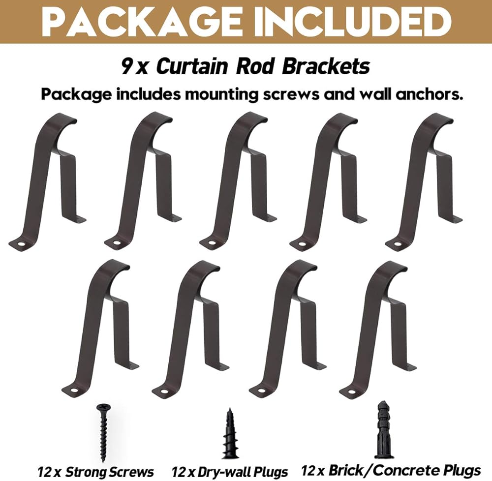9 pieces curtain rod brackets includes mounting screws and drywall anchors and concrete anchors.